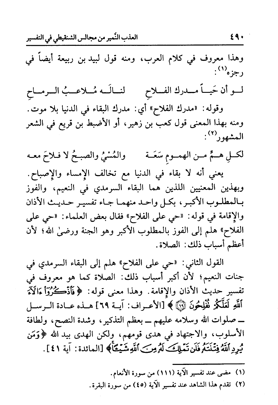 يعنِي أنه لا بقاءَ في الدنيا مع تخالفِ الإمساءِ والإصباحِ. وبهذين الْمَعْنَيَيْنِ اللذين هما البقاءُ السرمديُّ في النعيمِ، والفوزُ بالمطلوبِ الأكبرِ، بكلِّ واحدٍ منهما جاءَ تفسيرُ حديثِ الأذانِ والإقامةِ في قولِه: «حَيَّ عَلَى الْفَلاَحِ» فقال بعضُ العلماءِ: «حَيَّ عَلَى الْفَلاَحِ» هَلُمَّ إلى الفوزِ بالمطلوبِ الأكبرِ وهو الجنةُ وَرِضَى اللهِ؛ لأن أعظمَ أسبابِ ذلك: الصلاةُ.