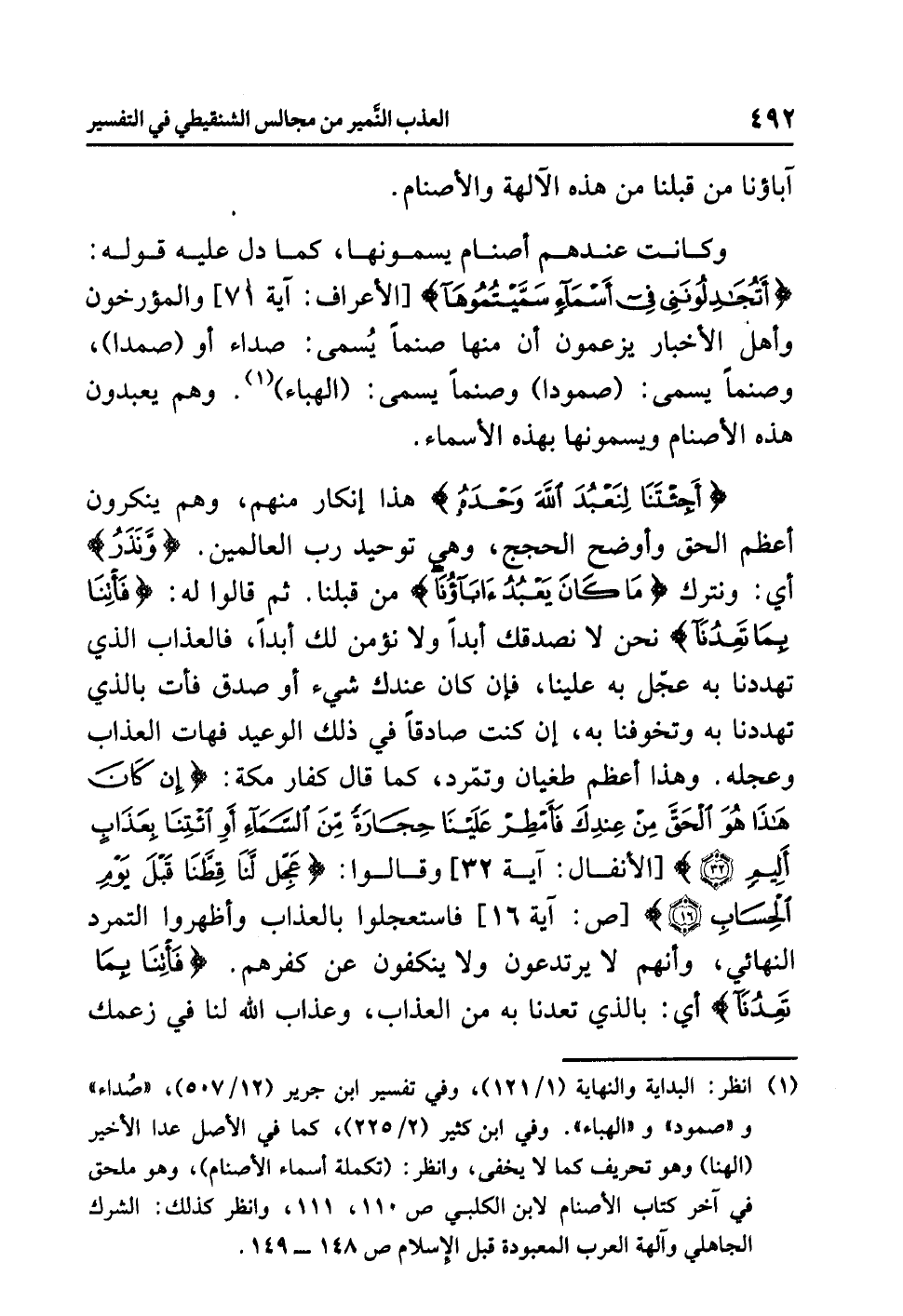 وكانت عندَهم أصنامٌ يسمونها، كما دَلَّ عليه قولُه: {أَتُجَادِلُونَنِي فِي أَسْمَاءٍ سَمَّيْتُمُوهَا} [الأعراف: آية 71] والمؤرخونَ وأهلُ الأخبارِ يزعمونَ أن منها صَنَمًا يُسَمَّى: صداء أو (صمدا)، وَصَنَمًا يُسَمَّى: (صمودا) وصنمًا يُسَمَّى: (الهباء) (¬1). وهم يعبدونَ هذه الأصنامَ ويسمونَها بهذه الأسماءِ.