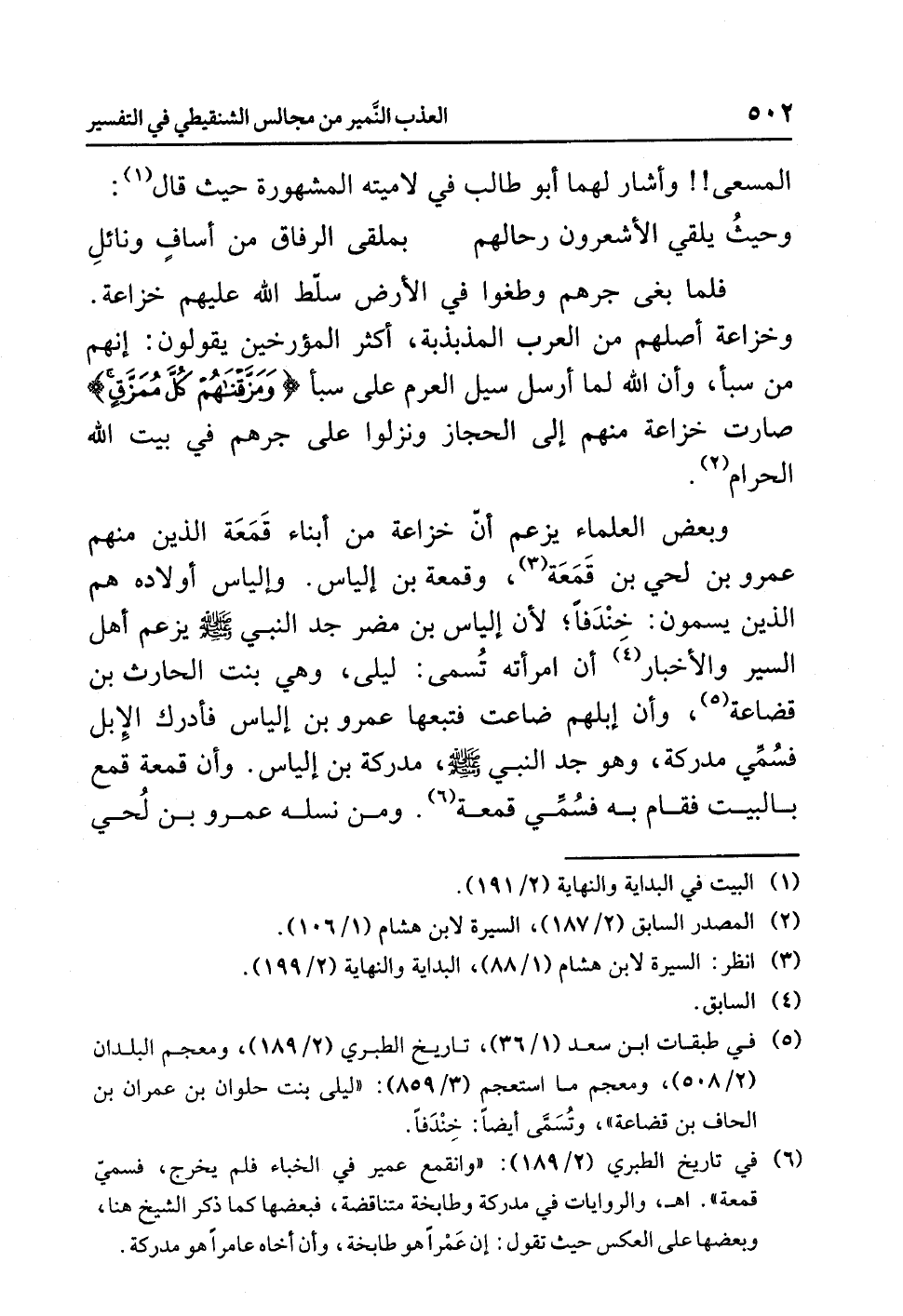 وبعضُ العلماءِ يزعمُ أنَّ خزاعةَ من أبناءِ قَمَعَةَ الذين منهم عمرُو بنُ لحيِّ بنِ قَمَعَةَ (¬3)، وقمعةُ بنُ إلياسَ. وإلياسُ أولادُه هم الذين يُسَمَّوْنَ: خِنْدَفًا؛ لأن إلياسَ بنَ مضرَ جَدَّ النبيِّ صلى الله عليه وسلم يزعمُ أهلُ السيرِ والأخبارِ (¬4) أن امرأتَه تُسَمَّى: ليلى، وهي بنتُ الحارثِ بنِ قضاعةَ (¬5)، وأن إبلَهم ضَاعَتْ فَتَبِعَهَا عمرُو بنُ إلياسَ فأدرك الإبلَ فسُمِّي مدركةَ، وهو جَدُّ النبيِّ صلى الله عليه وسلم، مدركةُ بنُ إلياسَ. وأن قمعةَ قَمَعَ بالبيت فقام به فسُمِّي قمعة (¬6). وَمِنْ نسلِه عمرُو بنُ لُحَيٍّ
