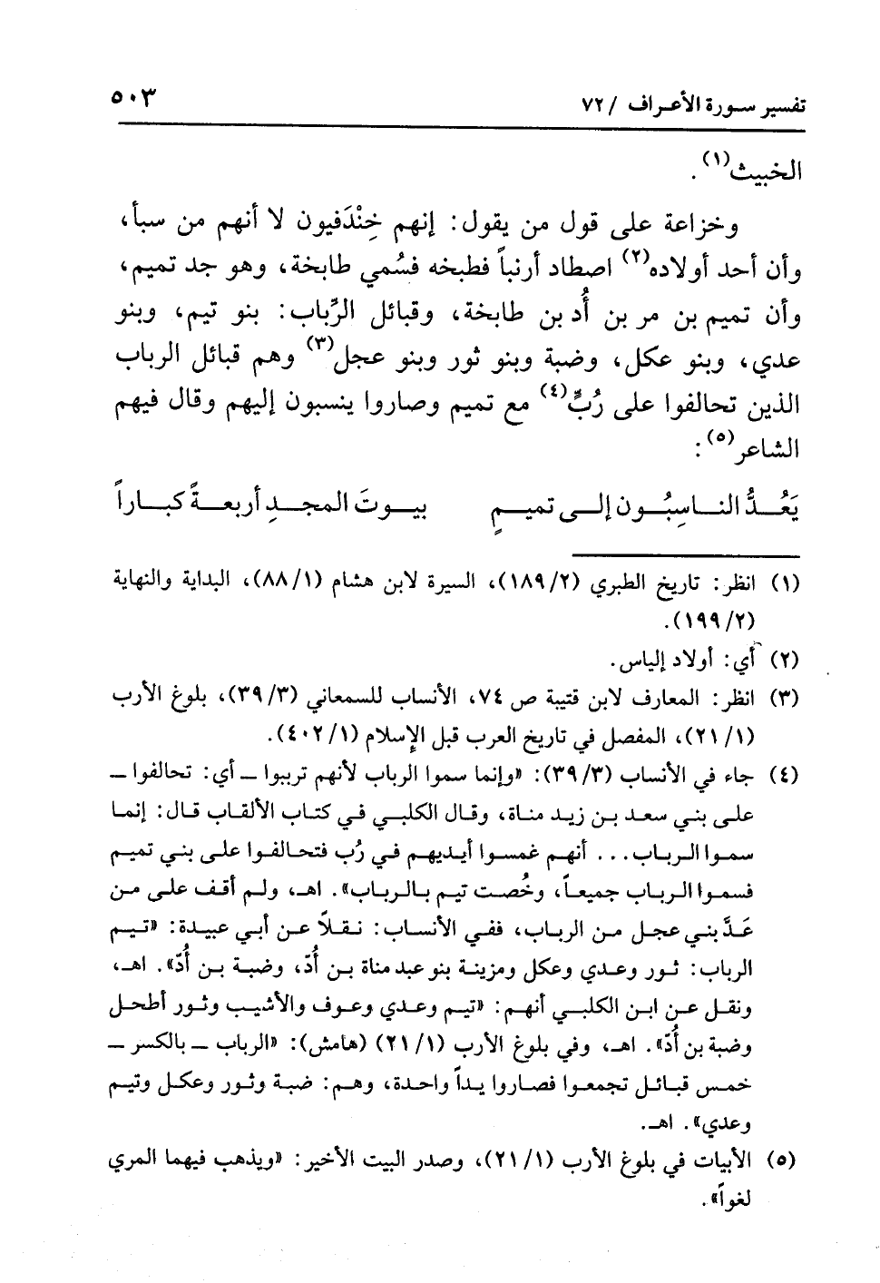 يَعُدُّ النَّاسِبُونَ إِلَى تَمِيمٍ ... بُيُوتَ الْمَجْدِ أَرْبَعَةً كِبَارَا