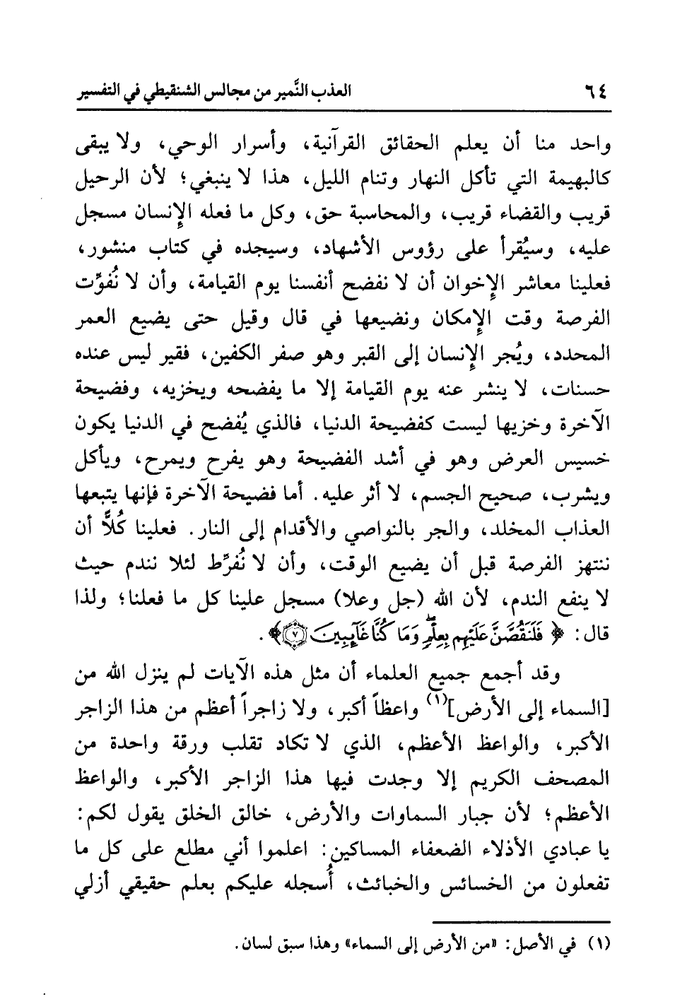 واحد منا أن يعلم الحقائق القرآنية، وأسرار الوحي، ولا يبقى كالبهيمة التي تأكل النهار وتنام الليل، هذا لا ينبغي؛ لأن الرحيل قريب والقضاء قريب، والمحاسبة حق، وكل ما فعله الإنسان مُسَجَّل عَلَيْهِ، وسيُقرأ على رؤوس الأشهاد، وسيجده في كتاب منشور، فعلينا معاشر الإخوان أن لا نفضح أنفسنا يوم القيامة، وأن لا نُفوِّت الفرصة وقت الإمكان ونضيعها في قال وقيل حتى يضيع العمر المحدد، ويُجر الإنسان إلى القبر وهو صفر الكفين، فقير ليس عنده حسنات، لا ينشر عنه يوم القيامة إلا ما يفضحه ويخزيه، وفضيحة الآخرة وخزيها ليست كفضيحة الدنيا، فالذي يُفضح في الدنيا يكون خسيس العرض وهو في أشد الفضيحة وهو يفرح ويمرح، ويأكل ويشرب، صحيح الجسم، لا أثر عليه، أما فضيحة الآخرة فإنها يتبعها العذاب المخلد، والجر بالنواصي والأقدام إلى النار. فعلينا كُلاًّ أن ننتهِز الفرصة قبل أن يضيع الوقت، وأن لا نُفرِّط لئلا نندم حيث لا ينفع الندم، لأن الله (جل وعلا) مسجل علينا كل ما فعلنا؛ ولذا قال: {فَلَنَقُصَّنَّ عَلَيْهِم بِعِلْمٍ وَمَا كُنَّا غَآئِبِينَ (7)}.