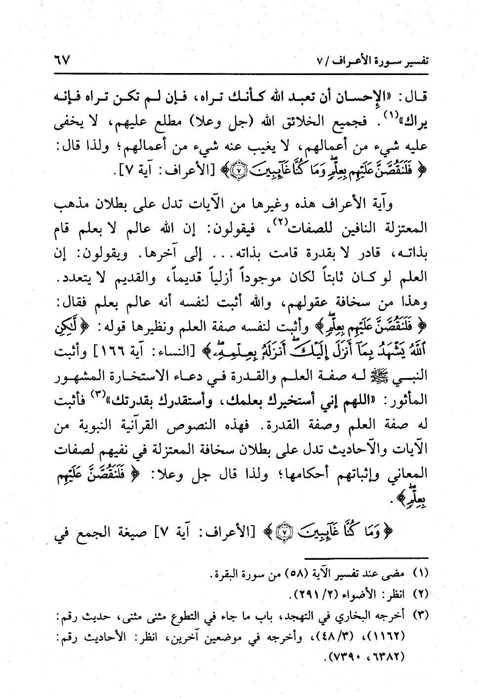 وآية الأعراف هذه وغيرها من الآيات تدل على بطلان مذهب المعتزلة النافين للصفات (¬2)، فيقولون: إن الله عالم لا بعلم قام بذاته، قادر لا بقدرة قامت بذاته ... إلى آخرها. ويقولون: إن العلم لو كان ثابتاً لكان موجوداً أزليّاً قديماً، والقديم لا يتعدد. وهذا من سخافة عقولهم، والله أثبت لنفسه أنه عالم بعلم فقال: {فَلَنَقُصَّنَّ عَلَيْهِم بِعِلْمٍ} وأثبت لنفسه صفة العلم ونظيرها قوله: {لَكِنِ الله يَشْهَدُ بِمَا أَنزَلَ إِلَيْكَ أَنزَلَهُ بِعِلْمِهِ} [النساء: آية 166] وأثبت النبي صلى الله عليه وسلم له صفة العلم والقدرة في دعاء الاستخارة المشهور المأثور: اللَّهُمَّ إِنِّي أَسْتَخِيرُكَ بِعِلْمِكَ، وَأَسْتَقْدِرُكَ بِقُدْرَتِكَ» (¬3) فأثبت له صفة العلم وصفة القدرة. فهذه النصوص القرآنية النبوية من الآيات والأحاديث تدل على بطلان سخافة المعتزلة في نفيهم لصفات المعاني وإثباتهم أحكامها؛ ولذا قال جل وعلا: {فَلَنَقُصَّنَّ عَلَيْهِم بِعِلْمٍ}.
