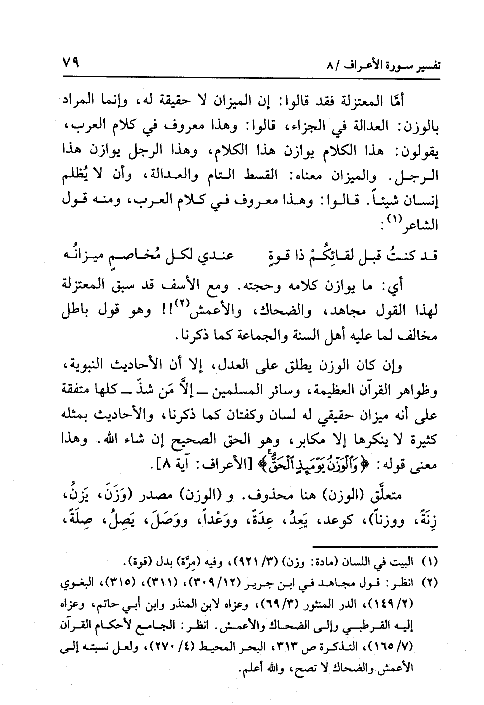 وإن كان الوزن يطلق على العدل، إلا أن الأحاديث النبوية، وظواهر القرآن العظيمة، وسائر المسلمين -إلا من شذّ- كلها متفقة على أنه ميزان حقيقي له لسان وكفتان كما ذكرنا، والأحاديث بمثله كثيرة لا ينكرها إلا مكابر، وهو الحق الصحيح إن شاء الله، وهذا معنى قوله: {وَالْوَزْنُ يَوْمَئِذٍ الْحَقُّ} [الأعراف: آية 8].