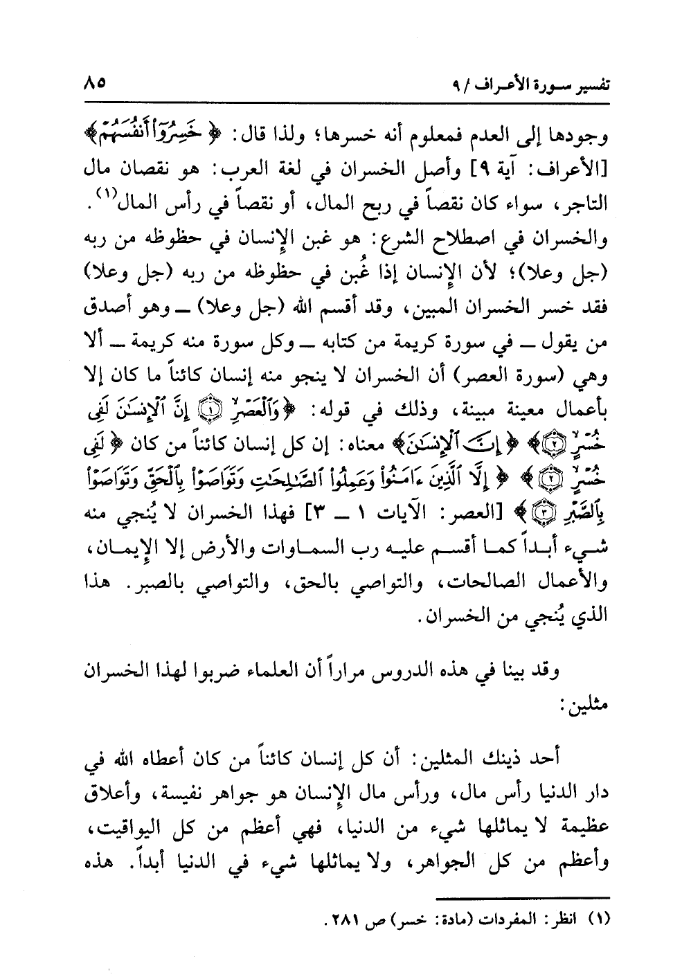 وجودها إلى العدم فمعلوم أنه خسرها؛ ولذا قال: {خَسِرُواْ أَنفُسَهُم} [الأعراف: آية 9] وأصل الخسران في لغة العرب: هو نقصان مال التاجر، سواء كان نقصاً في ربح المال، أو نقصاً في رأس المال (¬1).