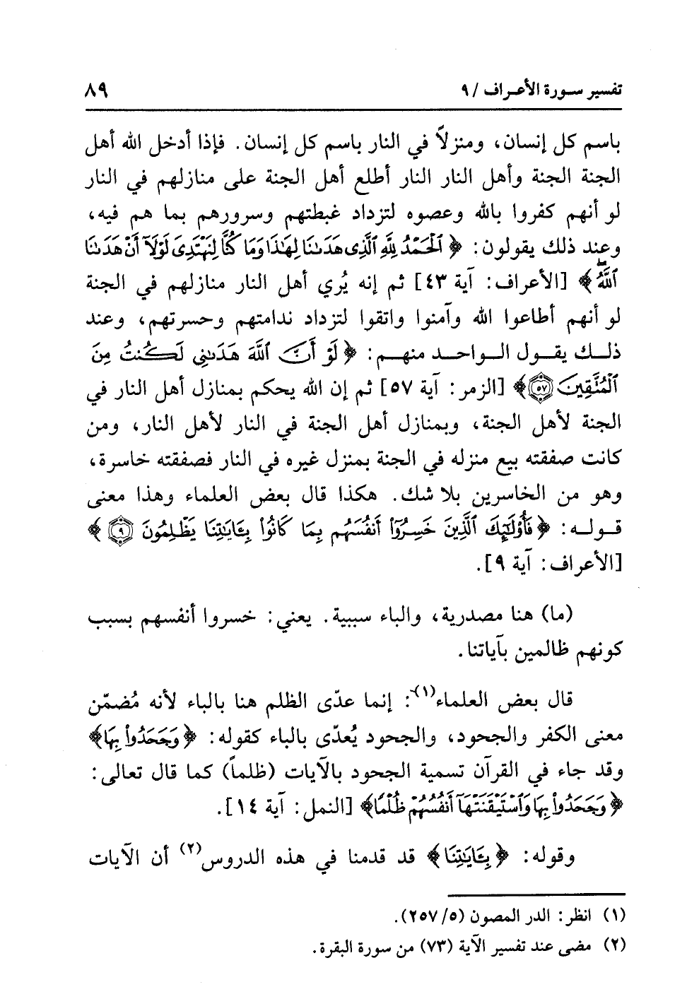 باسم كل إنسان، ومنزلاً في النار باسم كل إنسان. فإذا أدخل الله أهل الجنة الجنة وأهل النار النار أطلع أهل الجنة على منازلهم في النار لو أنهم كفروا بالله وعصوه لتزداد غبطتهم وسرورهم بما هم فيه، وعند ذلك يقولون: {الْحَمْدُ لِلّهِ الَّذِي هَدَانَا لِهَذَا وَمَا كُنَّا لِنَهْتَدِيَ لَوْلا أَنْ هَدَانَا الله} [الأعراف: آية 43] ثم إنه يُري أهل النار منازلهم في الجنة لو أنهم أطاعوا الله وآمنوا واتقوا لتزداد ندامتهم وحسرتهم، وعند ذلك يقول الواحد منهم: {لَوْ أَنَّ الله هَدَانِي لَكُنتُ مِنَ الْمُتَّقِينَ} [الزمر: آية 57] ثم إن الله يحكم بمنازل أهل النار في الجنة لأهل الجنة، وبمنازل أهل الجنة في النار لأهل النار، ومن كانت صفقته بيع منزله في الجنة بمنزل غيره في النار فصفقته خاسرة، وهو من الخاسرين بلا شك. هكذا قال بعض العلماء وهذا معنى قوله: {فَأُوْلَئِكَ الَّذِينَ خَسِرُواْ أَنفُسَهُم بِمَا كَانُواْ بِآيَاتِنَا يِظْلِمُونَ} [الأعراف: آية 9].