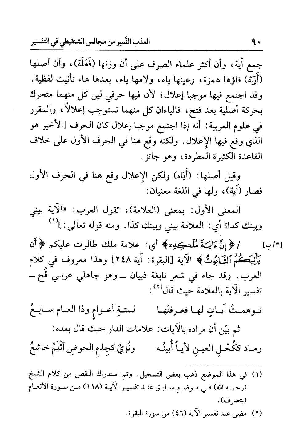 جمع آية، وأن أكثر علماء الصرف على أن وزنها (فَعَلَة)، وأن أصلها (أَيَيَة) فاؤها همزة، وعينها ياء، ولامها ياء، بعدها هاء تأنيث لفظية. وقد اجتمع فيها موجبَا إعلال؛ لأن فيها حرفي لين كل منهما متحرك بِحَرَكَةٍ أصلِيَّةٍ بعد فتح، فالياءان كل منهما تستوجب إعلالاً، والمقرر في علوم العربية: أنه إذا اجتمع موجِبَا إعلال كان الحرف [الأخير هو الذي وقع فيها الإعلال، ولكنه وقع هنا في الحرف الأول على خلاف القاعدة الكثيرة المطردة، وهو جائز.