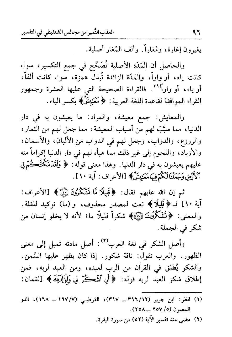 والحاصل أن المَدَّة الأصلية تُصَحَّح في جمع التكسير، سواء كانت ياء، أو واواً، والمَدَّة الزائدة تُبدل همزة، سواء كانت ألفاً، أو ياء، أو واواً (¬1). فالقراءة الصحيحة التي عليها العشرة وجمهور القراء الموافقة لقاعدة اللغة العربية: {مَعَايِشَ} بكسر الياء.