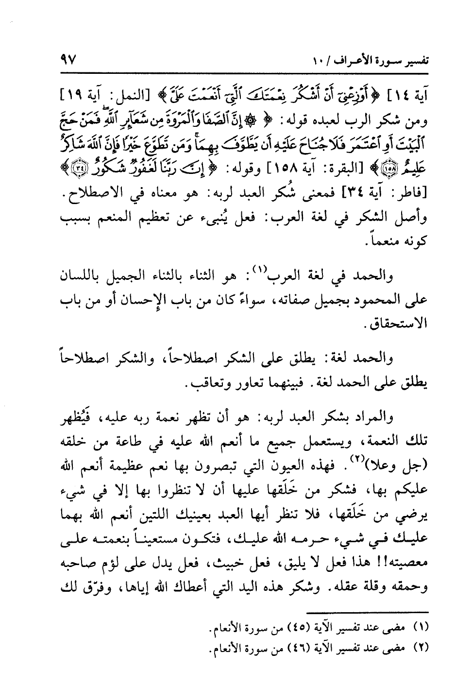 آية 14] {أَوْزِعْنِي أَنْ أَشْكُرَ نِعْمَتَكَ الَّتِي أَنْعَمْتَ عَلَيَّ} [النمل: آية 19] ومن شكر الرب لعبده قوله: {إِنَّ الصَّفَا وَالْمَرْوَةَ مِن شَعَآئِرِ اللهِ فَمَنْ حَجَّ الْبَيْتَ أَوِ اعْتَمَرَ فَلاَ جُنَاحَ عَلَيْهِ أَن يَطَّوَّفَ بِهِمَا وَمَن تَطَوَّعَ خَيْراً فَإِنَّ اللهَ شَاكِرٌ عَلِيمٌ (158)} [البقرة: آية 158] وقوله: {إِنَّ رَبَّنَا لَغَفُورٌ شَكُورٌ} [فاطر: آية 34] فمعنى شُكر العبد لربه: هو معناه في الاصطلاح. وأصل الشكر في لغة العرب: فعل يُنبئ عن تعظيم المنعم بسبب كونه مُنْعِماً.