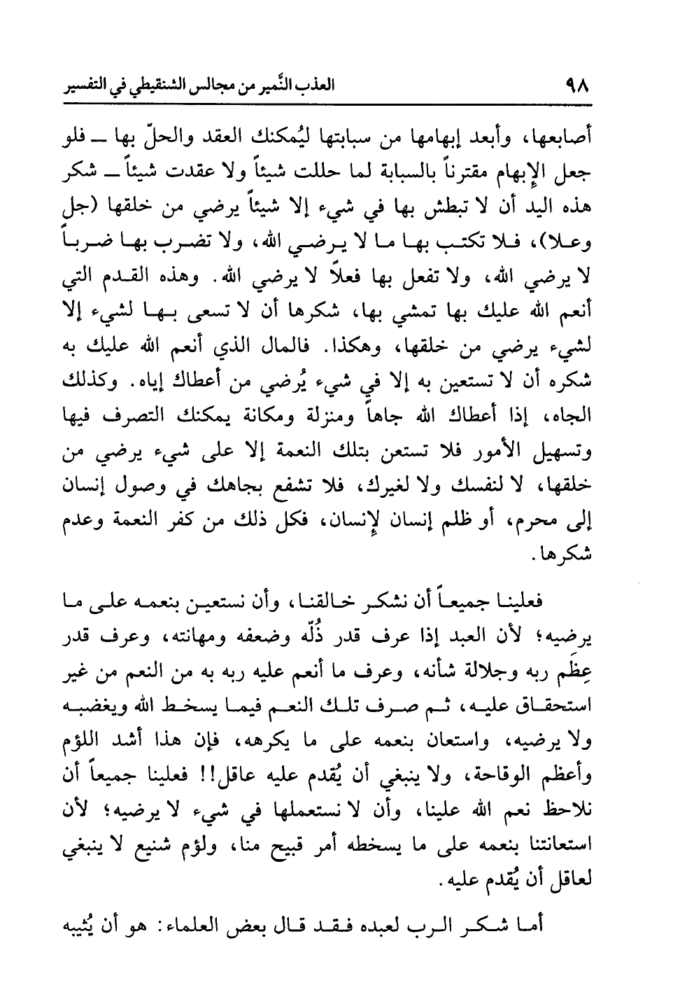 أصابعها، وأبعد إبهامها من سبابتها ليُمكنك العقد والحلّ بها - فلو جعل الإبهام مقترناً بالسبابة لما حللت شيئاً ولا عقدت شيئاً - شكر هذه اليد أن لا تبطش بها في شيء إلا شيئاً يُرْضِي مَنْ خَلَقَهَا (جل وعلا)، فلا تكتب بها ما لا يرضي الله، ولا تضرب بها ضرباً لا يرضي الله، ولا تفعل بها فعلاً لا يرضي الله. وهَذِهِ القَدَمُ الّتي أنْعَمَ الله عليك بها، تمْشِي بها، شُكْرُهَا: أن لا تسعى بها لشيء إلا لشيء يرضي مَنْ خَلَقَها، وهكذا. فالمال الذي أنْعَمَ اللهُ عَلَيْكَ به شُكْرُهُ: أن لا تَسْتَعيِن به إلا في شيء يُرْضِي مَنْ أَعْطَاكَ إِيَّاهُ، وكذلك الجاه، إذا أعطاك اللهُ جَاهاً ومَنْزِلَة ومكانة يمكنك التصرُّف فيها وتسهيل الأمور فلا تَسْتَعِنْ بِتِلْكَ النعمة إلا على شيء يُرْضِي مَنْ خَلَقَهَا، لا لنفسك ولا لغيرك، فلا تشفع بِجَاهِكَ في وصول إنسان إلى محرَّم، أو ظلم إنسان لإنسان، فكل ذلك من كُفْرِ النِّعْمَةِ وعَدَمِ شُكْرِهَا.