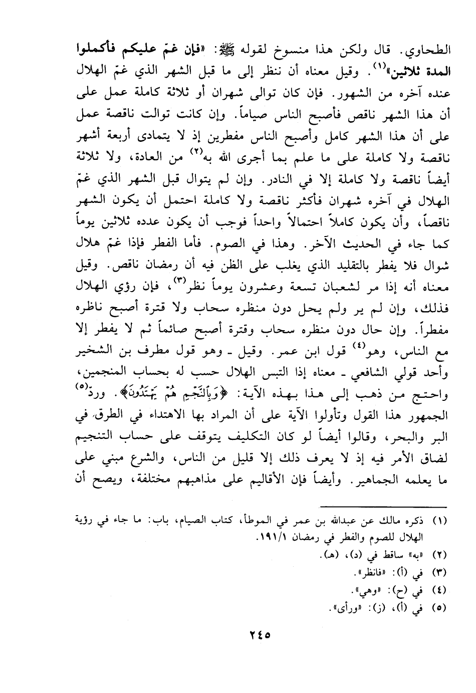 الطحاوي. قال ولكن هذا منسوخ لقوله صلى الله عليه وسلم: ((فإن غم عليكم فأكملوا المدة ثلاثين)). وقيل معناه أن ننظر إلى ما قبل الشهر الذي غم الهلال عند آخره من الشهور. فإن كان توالى شهران أو ثلاثة كاملة عمل على أن هذا الشهر ناقص فأصبح الناس صيامًا. وإن كانت توالت ناقصة عمل على أن هذا الشهر كامل وأصبح الناس مفطرين إذ لا يتمادى أربعة أشهر ناقصة ولا كاملة إلا في النادر. وإن لم يتوال قبل الشهر الذي غم الهلال في آخره شهران فأكثر ناقصة ولا كاملة احتمل أن يكون الشهر ناقصًا، وأن يكون كاملًا واحدًا فوجب أن يكون عدده ثلاثين يومًا كما جاء في الحديث الآخر. وهذا في الصوم. فأما الفطر فإذا غم هلال شوال فلا يفطر بالتقليد الذي يغلب على الظن فيه أن رمضان ناقص. وقيل معناه أنه إذا مر لشعبان تسعة وعشرون يومًا نظر، فإن رؤي الهلال فذلك، وإن لم ير ولم يحل دون منظره سحاب ولا قترة أصبح ناظره مفطرًا. وإن حال دون منظره سحاب وقترة أصبح صائمًا ثم لا يفطر إلا مع الناس، وهو قول ابن عمر. وقيل -وهو قول مطرف بن الشخير وأحد قولي الشافعي- معناه إذا التبس الهلال حسب له بحساب المنجمين، واحتج من ذهب إلى هذا بهذه الآية: {وبالنجم هم يهتدون}. ورد الجمهور هذا القول وتأولوا الآية على أن المراد بها الاهتداء في الطرق في البر والبحر، وقالوا أيضًا لو كان التكليف يتوقف على حساب التنجيم لضاق الأمر فيه إذ لا يعرف ذلك إلا قليل من الناس، والشرع مبني على ما يعلمه الجماهير. وأيضًا فإن الأقاليم على مذاهبهم مختلفة، ويصح أن