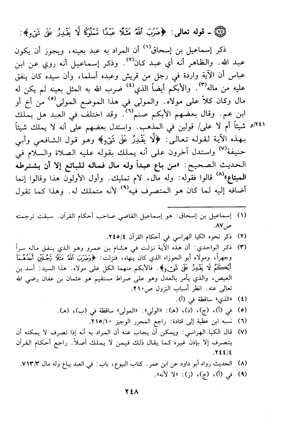 ذكر إسماعيل بن إسحاق أن المراد به عبد بعينه، ويجوز أن يكون عبد الله. والظاهر أنه أي عبد كان. وذكر إسماعيل أنه روي عن ابن عباس أن الآية واردة في رجل من قريش وعبد أسلما، وأن سيده كان ينفق عليه من ماله. والأبكم أيضًا الذي ضرب الله به المثل بعينه لم يكن له مال وكان كلًا على مولاه. والمولى في هذا الموضع المولى من أخ أو ابن عم. وقال بعضهم الأبكم صنم. وقد اختلف في العبد هل يملك شيئًا أم لا على قولين في المذهب. واستدل بعضهم على أنه لا يملك شيئًا بهذه الآية لقوله تعالى: {لا يقدر على شيء} وهو قول الشافعي وأبي حنيفة واستدل آخرون على أنه يملك بقوله عليه الصلاة والسلام في الحديث الصحيح: ((من باع عبدًا وله مال فماله للبائع إلا أن يشترطه المبتاع)) قالوا فقوله: وله مال، لام تمليك. وأول الأولون هذا وقالوا إنما أضافه إليه لما كان المتصرف فيه لأنه متملك له. وهذا كما تقول
