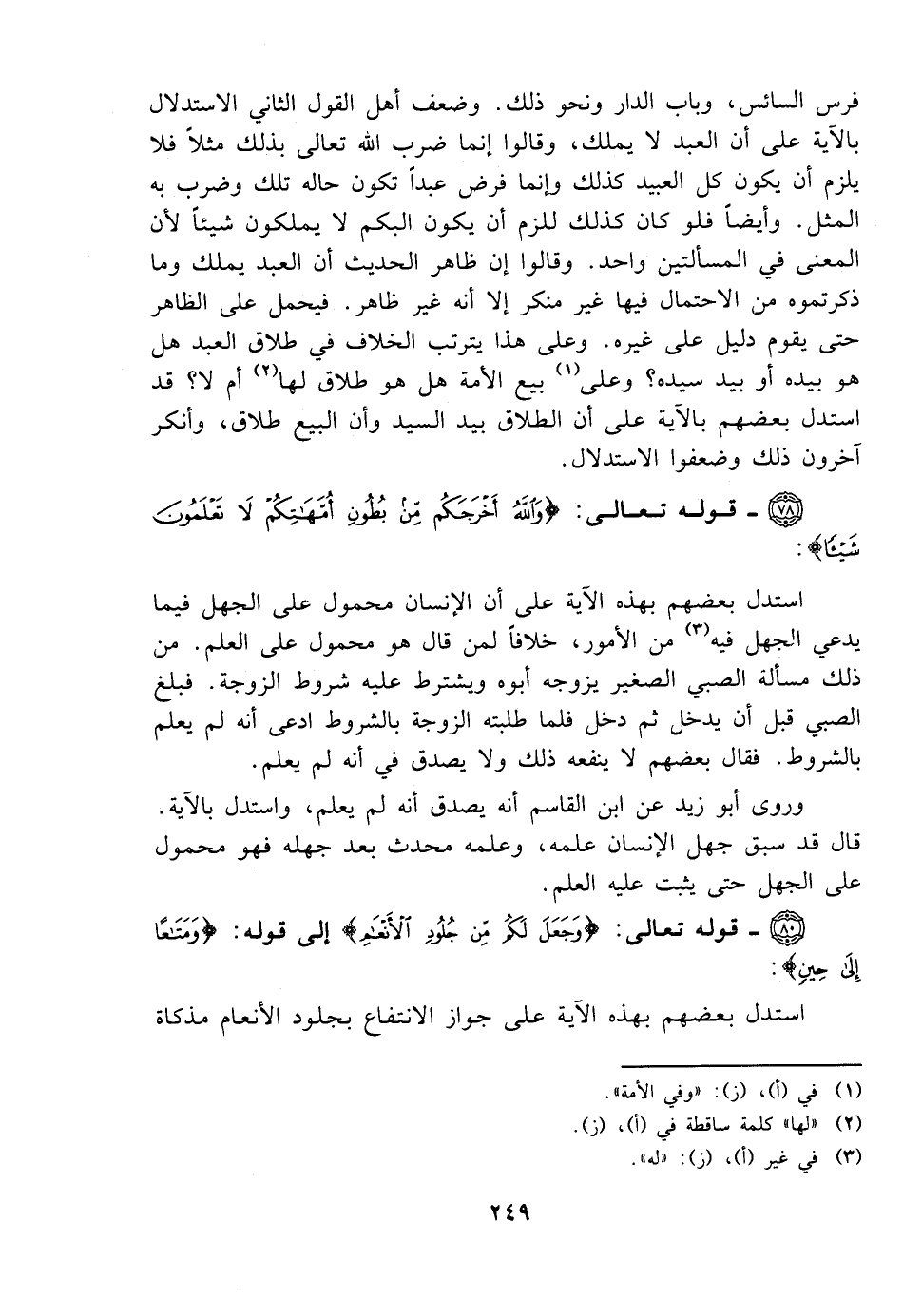 فرس السائس، وباب الدار ونحو ذلك. وضعف أهل القول الثاني الاستدلال بالآية على أن العبد لا يملك، وقالوا إنما ضرب الله تعالى بذلك مثلًا فلا يلزم أن يكون كل العبيد كذلك وإنما فرض عبدًا تكون حاله تلك وضرب به المثل. وأيضًا فلو كان كذلك للزم أن يكون البكم لا يملكون شيئًا لأن المعنى في المسألتين واحد. وقالوا إن ظاهر الحديث أن العبد يملك وما ذكرتموه من الاحتمال فيها غير منكر إلا أنه غير ظاهر. فيحمل على الظاهر حتى يقوم دليل على غيره. وعلى هذا يترتب الخلاف في طلاق العبد هل هو بيده أو بيد سيده؟ وعلى بيع الأمة هل هو طلاق لها أم لا؟ قد استدل بعضهم بالآية على أن الطلاق بيد السيد وأن البيع طلاق، وأنكر آخرون ذلك وضعفوا الاستدلال.