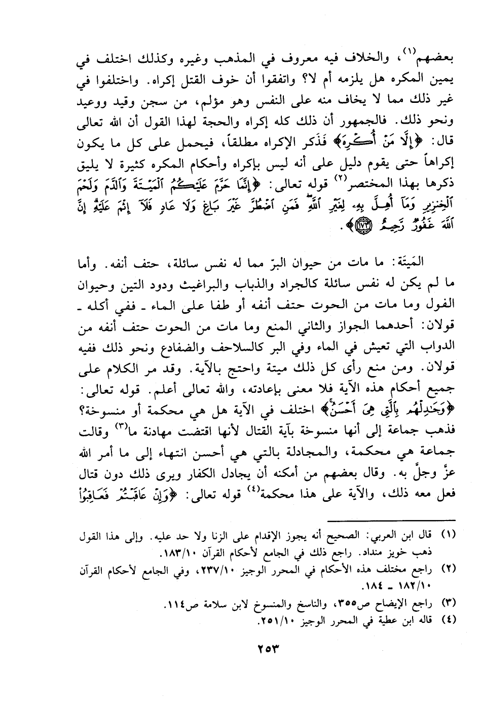الميتة: ما مات من حيوان البر مما له نفس سائلة، حتف أنفه. وأما ما لم يكن له نفس سائلة كالجراد والذباب والبراغيث ودود التين وحيوان الفول وما مات من الحوت حتف أنفه أو طفا على الماء -ففي أكله- قولان: أحدهما الجواز والثاني المنع، وما مات من الحوت حتف أنفه من الدواب التي تعيش في الماء وفي البر كالسلاحف والضفادع وحنو ذلك ففيه قولان. ومن منع رأى كل ذلك ميتة واحتج بالآية. وقد مر الكلام على جميع أحكام هذه الآية فلا معنى بإعادته، والله تعالى أعلم. قوله تعالى: {وجادلهم بالتي هي أحسن} اختلف في الآية هل هي محكمة أو منسوخة؟ فذهب جماعة إلى أنها منسوخة بآية القتال لأنها اقتضت مهادنة ما وقالت جماعة هي محكمة، والمجادلة بالتي هي أحسن انتهاء إلى أمر الله عز وجل به. وقال بعضهم من أمكنه أن يجادل الكفار ويرى ذلك دون قتال فعل معه ذلك، والآية على هذا محكمة قوله تعالى: {وإن عاقبتم فعاقبوا