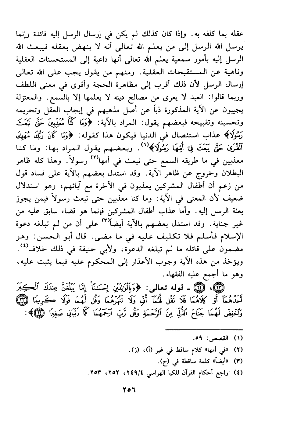 عقله بما كلفه به. وإذا كان كذلك لم يكن في إرسال الرسل إليه فائدة وإنما يرسل الله الرسل إلى من يعلم الله تعالى أنه لا ينهض بعقله فيبعث الله الرسل إليه بأمور سمعية يعلم الله تعالى أنها داعية إلى المستحسنات العقلية وناهية عن المستقبحات العقلية. ومنهم من يقول يجب على الله تعالى إرسال الرسل لأن ذلك أقرب إلى مظاهرة الحجة وأقوى في معنى اللطف وربما قالوا: العبد لا يعرى من مصالح دينه لا يعلمها إلا بالسمع. والمعتزلة يجيبون عن الآية المذكورة ذبًا عن أصل مذهبهم في إيجاب العقل وتحريمه وتحسينه وتقبيحه فبعضهم يقول: المراد بالآية: {وما كنا معذبين حتى نبعث رسولًا} عذاب استئصال في الدنيا فيكون هذا كقوله: {وما كان ربك مهلك القرى حتى يبعث في أمها رسولًا}. وبعضهم يقول المراد بها: وما كنا معذبين حتى نبعث في أمها رسولًا. وهذا كله ظاهر البطلان وخروج عن ظاهر الآية. وقد استدل بعضهم بالآية أيضًا على فساد قول من زعم أن أطفال المشركين يعذبون في الآخرة مع آبائهم، وهو استدلال ضعيف لأن المعنى في الآية: وما كنا معذبين حتى نبعث رسولًا فيمن يجوز بعثة الرسل إليه. وأما عذاب أطفال المشركين فإنما هو قضاء سابق عليه من غير جناية. وقد استدل أيضًا على أن من لم تبلغه دعوة الإسلام فأسلم فلا تكليف عليه في ما مضى. قال أبو الحسن: وهو مضمون على قائله ما لم تبلغه الدعوة، ولأبي حنيفة في ذلك خلاف. ويؤخذ من هذه الآية وجوب الأعذار إلى المحكوم عليه فيما يثبت عليه، وهو ما أجمع عليه الفقهاء.