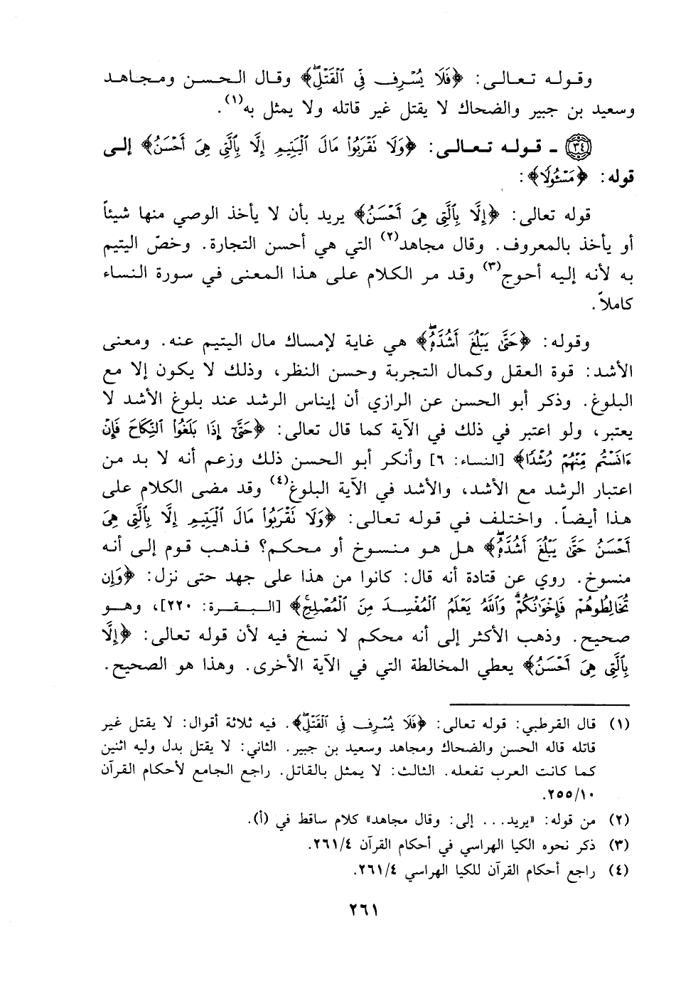 وقوله: {حتى يبلغ أشده} هي غاية لإمساك مال اليتيم عنه. ومعنى الأشد: قوة العقل وكمال التجربة وحسن النظر، وذلك لا يكون إلا مع البلوغ. وذكر أبو الحسن عن الرازي أن إيناس الرشد عند البلوغ لأشد لا يعتبر، ولو اعتبر في ذلك في الآية كما قال تعالى: {حتى إذا بلغوا النكاح فإن آنستم منهم رشدًا} [النساء: 6] وأنكر أبو الحسن ذلك وزعم أنه لا بد من اعتبار الرشد مع الأشد، والأشد في الآية البلوغ وقد مضى الكلام على هذا أيضًا. واختلف في قوله تعالى: {ولا تقربوا مال اليتيم إلا بالتي هي أحسن حتى يبلغ أشده} هل هو منسوخ أو محكم؟ فذهب قوم إلى أنه منسوخ. وروى عن قتادة أنه قال: كانوا من هذا على جهد حتى نزل: {وأن تخالطوهم فإخوانكم والله يعلم المفسد من المصلح} [البقرة: 220]، وهو صحيح. وذهب الأكثر إلى أنه محكم لا نسخ فيه لأن قوله تعالى: {إلا بالتي هي أحسن} يعطي المخالطة التي في الآية الأخرى. وهذا هو الصحيح.