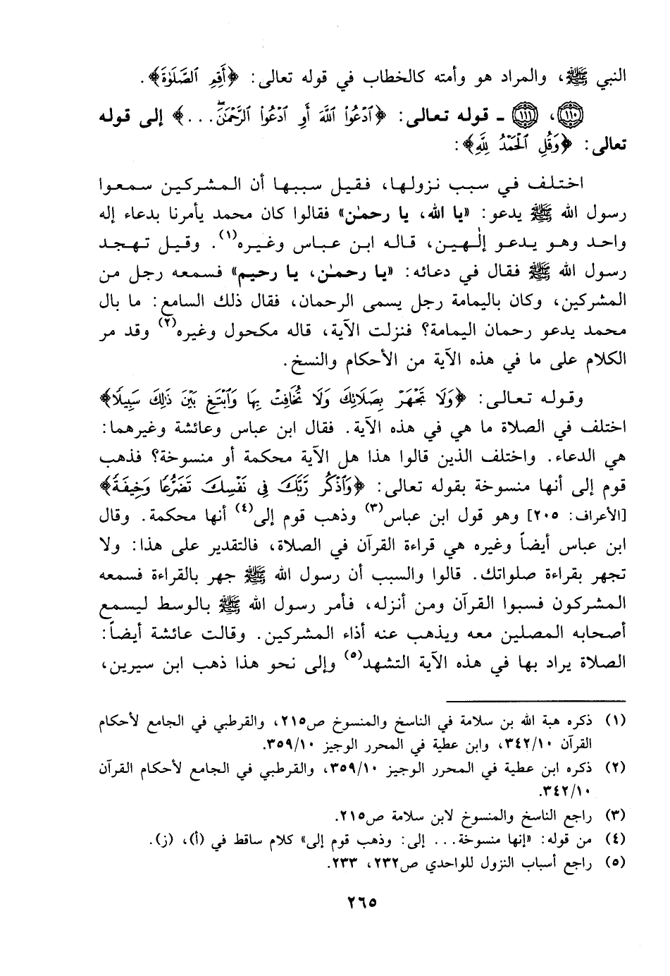 وقوله تعالى: {ولا تجهر بصلاتك ولا تخافت بها وابتغ بين ذلك سبيلًا} اختلف في الصلاة ما هي في هذه الآية. فقال ابن عباس وعائشة وغيرهما: هي الدعاء. واختلف الذين قالوا هذا هل الآية محكمة أو منسوخة؟ فذهب قوم إلى أنها منسوخة بقوله تعالى: {واذكر ربك في نفسك تضرعًا وخيفة} [الأعراف: 205] وهو قول ابن عباس وذهب قوم إلى أنها محكمة. وقال ابن عباس أيضًا وغيره هي قراءة القرآن في الصلاة، فالتقدير على هذا: ولا تجهر بقراءة صلواتك. قالوا والسبب أن رسول الله صلى الله عليه وسلم جهر بالقراءة فسمعه المشركون فسبوا القرآن ومن أنزله، فأمر رسول الله صلى الله عليه وسلم بالوسط ليسمع أصحابه المصلين معه ويذهب عنه أذاء المشركين. وقالت عائشة أيضًا: الصلاة يراد بها في هذه الآية التشهد، وإلى نحو هذا ذهب ابن سيرين،