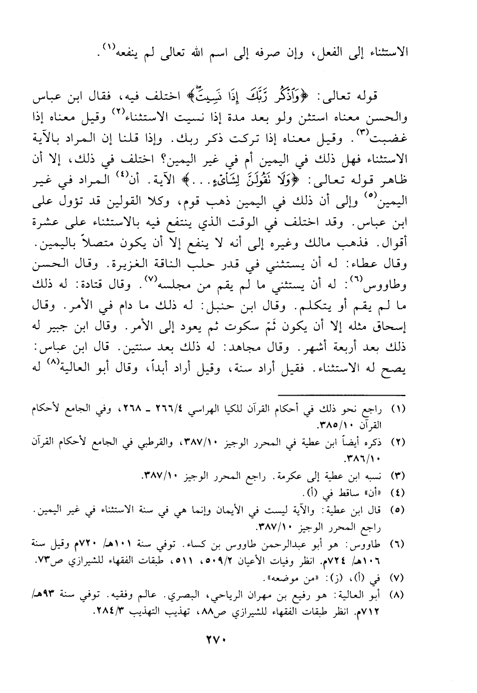 قوله تعالى: {واذكر بك إذا نسيت} اختلف فيه، فقال ابن عباس والحسن معنها استثن ولو بعد مدة إذا نسيت الاستثناء. وقيل معناه إذا غضبت. وقيل معناه إذا تركت ذكر ربك. وإذا قلنا إن المراد بالآية الاستثناء فهل ذلك في اليمين أم في غير اليمين؟ اختلف في ذلك، إلا أن ظاهر قوله تعالى: {زلا تقولن لشيء ... } الآية. أن المراد في غير اليمين وإلى أن ذلك في الوقت الذي ينتفع فيه بالاستثناء على عشرة أقوال. فذهب مالك وغيره إلى أنه لا ينتفع إلا أن يكون متصلًا باليمين. وقال عطاء: له أن يستثني في قدر حلب الناقة الغزيرة. وقال الحسن وطاووس: له أن يستثني ما لم يقم من مجلسه. وقال قتادة: له ذلك ما لم يقم أو يتكلم. وقال ابن حنبل: له ذلك ما دام في الأمر. وقال إسحاق مثله إلا أن يكون ثم سكوت ثم يعود إلى الأمر. وقال ابن جبير له ذلك بعد أربعة أشهر. وقال مجاهد: له ذلك بعد سنتين. قال ابن عباس: يصح له الاستثناء. فقيل أراد سنة. وقيل أراد أبدًا، وقال أبو العالية له
