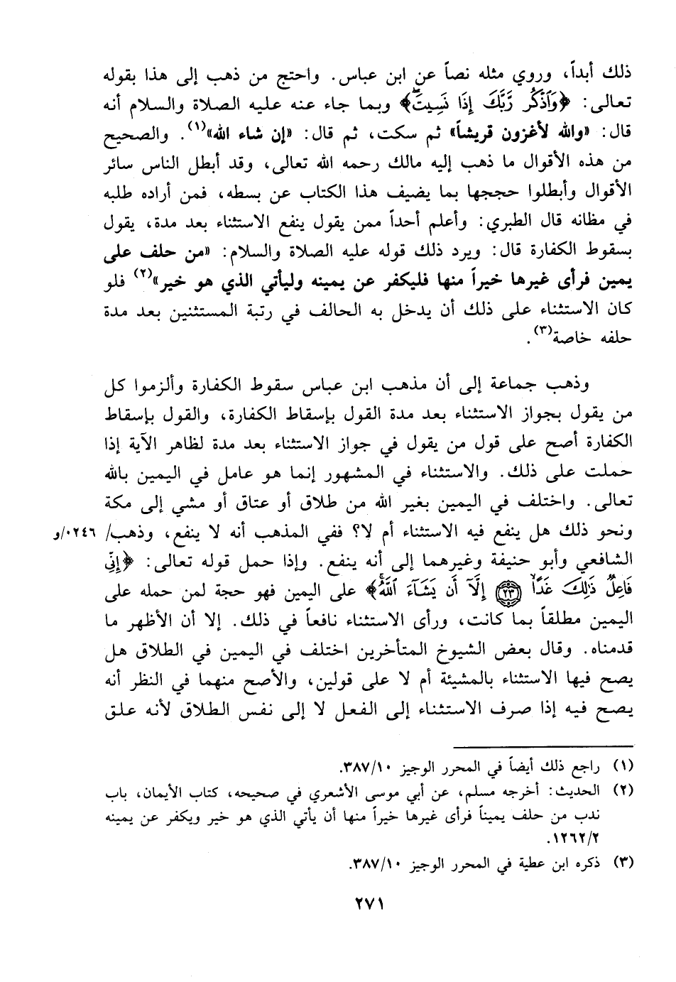 ذلك أبدًا، وروي مثله نصًا عن ابن عباس. واحتج من ذهب إلى هذا بقوله تعالى: {واذكر ربك إذا نسيت} وبما جاء عنه عليه الصلاة والسلام أنه قال: ((والله لأغزون قريشًا)) ثم سكت، ثم قال: ((إن شاء الله)). والصحيح من هذه الأقوال ما ذهب إليه مالك رحمه الله تعالى، وقد أبطل الناس سائر الأقوال وأبطلوا حججها بما يضيق هذا الكتاب عن بسطه، فمن أراد طلبه في مظانه قال الطبري: وأعلم أحدًا ممن يقول ينفع الاستثناء بعد مدة، يقول بسقوط الكفارة قال: ويرد ذلك قوله عليه الصلاة والسلام: ((من حلف على يمين فرأى غيرها خيرًا منها فليكفر عن يمينه وليأتي الذي هو خير)) فلو كان الاستثناء على ذلك أن يدخل به الحالف في رتبة المستثنين بعد مدة حلفه خاصة.
