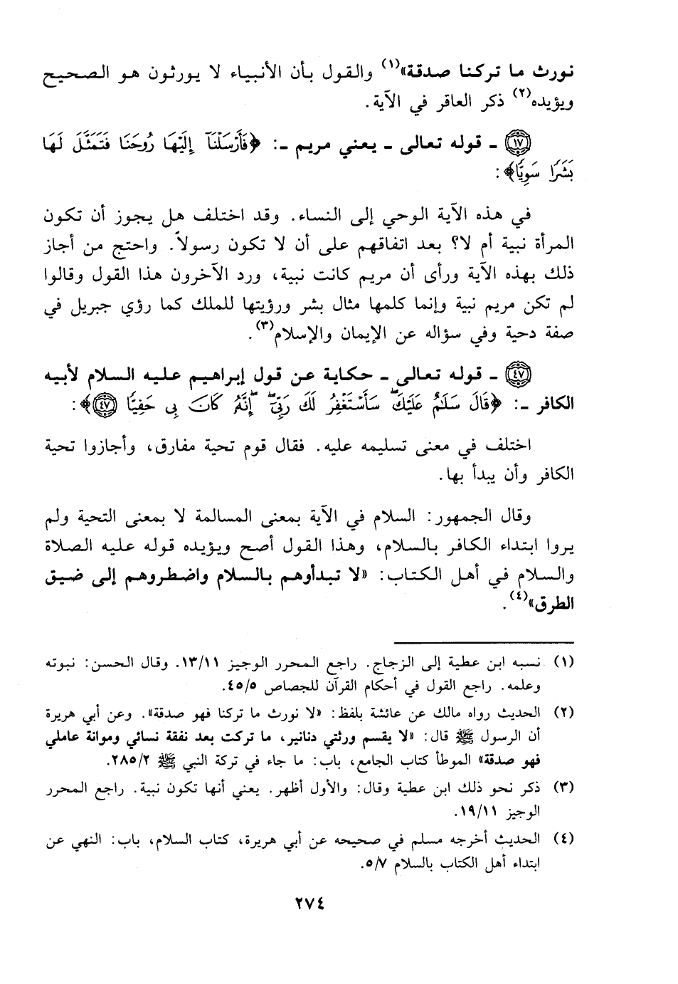 وقال الجمهور: السلام في الآية بمعنى المسالمة لا بمعنى التحية ولم يروا ابتداء الكافر بالسلام، وهذا القول أصح ويؤيده قوله عليه الصلاة والسلام في أهل الكتاب: ((لا تبدأوهم بالسلام واضطروهم إلى ضيق الطرق)).