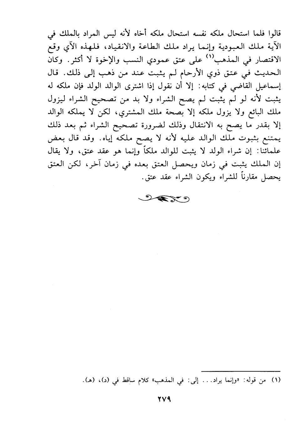 قالوا فلما استحال ملكه نفسه استحال ملكه أخاه لأنه ليس المراد بالملك في الآية ملك العبودية وإنما يراد ملك الطاعة والانقياد، فلهذه الآي وقع الاقتصار في المذهب على عتق عمودي النسب والإخوة لا أكثر. وكان الحديث في عتق ذوي الأرحام لم يثبت عند من ذهب إلى ذلك. قال إسماعيل القاضي في كتابه: إلا أن نقول إذا اشترى الوالد الولد فإن ملكه له يثبت لأنه لو لم يثبت لم يصح الشراء ولا بد من تصحيح الشراء ليزول ملك البائع ولا يزول ملكه إلا بصحة ملك المشتري، لكن لا يملكه الوالد إلا بقدر ما يصح به الانتقال وذلك لضرورة تصحيح الشراء ثم بعد ذلك يمتنع بثبوت مالك الوالد عليه لأنه لا يصح ملكه إياه. وقد قال بعض علمائنا: إن شراء الولد لا يثبت للوالد ملكًا وإنما هو عقد عتق، ولا يقال إن الملك يثبت في زمان ويحصل العتق بعده في زمان آخر، لكن العتق يحصل مقارنًا للشراء ويكون الشراء عقد عتق.