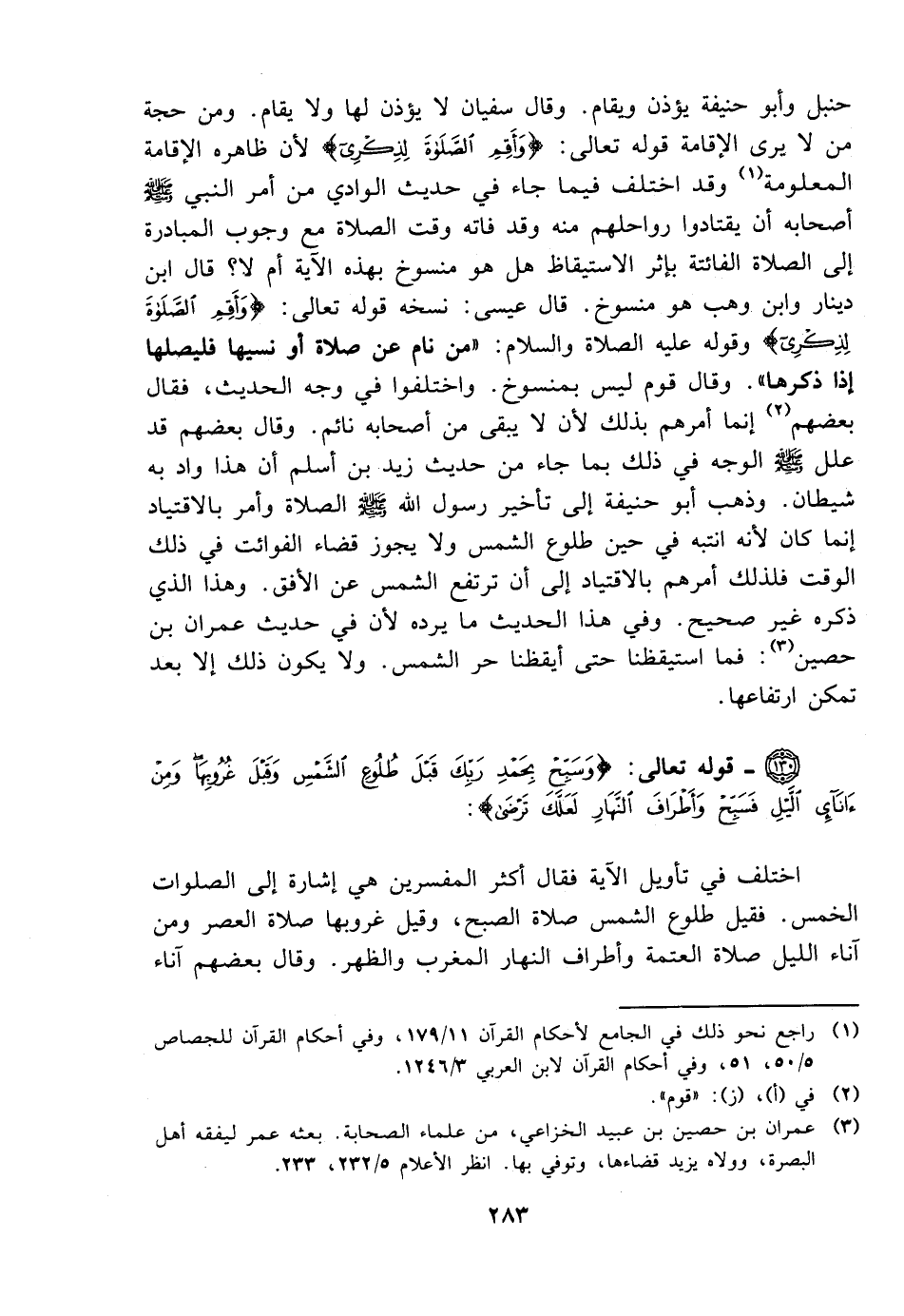 اختلف في تأويل الآية فقال أكثر المفسرين هي إشارة إلى الصلوات الخمس. فقيل طلوع الشمس صلاة الصبح، وقيل غروبها صلاة العصر ومن آناء الليل صلاة والعتمة وأطراف النهار والمغرب والظهر. وقال بعضهم آناء