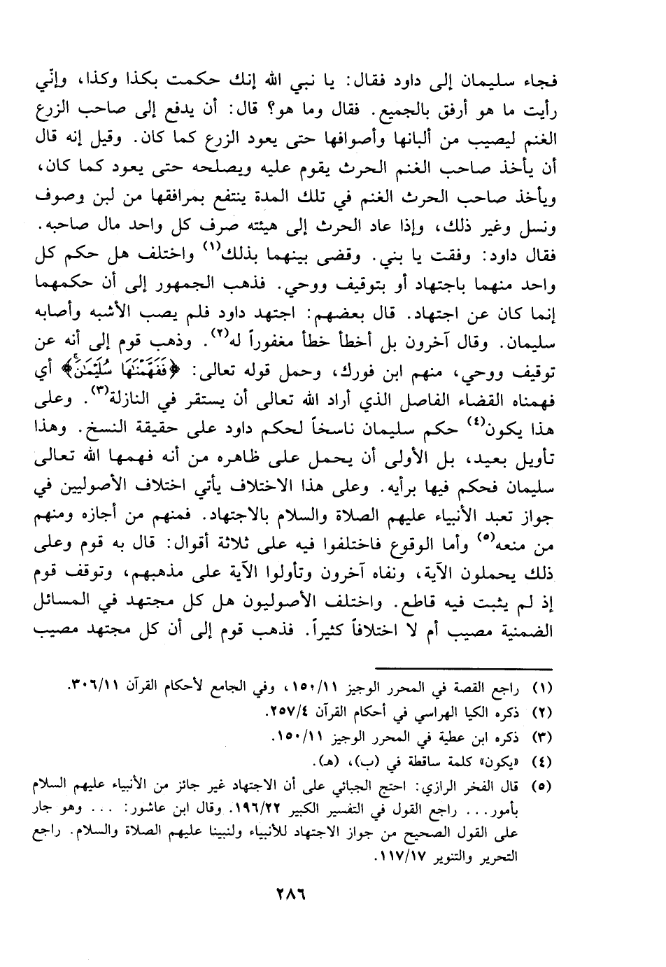 فجاء سليمان إلى داود فقال: يا نبي الله إنك حكمت بكذا وكذا، وإني أرى ما هو أرفق بالجميع. فقال وما هو؟ قال: أن يدفع إلى صاحب الزرع الغنم ليصيب من ألبانها وأصوافها حتى يعود الزرع كما كان. وقيل إنه قال أن يأخذ صاحب الغنم الحرث يقوم عليه ويصلحه حتى يعود كما كان، ويأخذ صاحب الحرث لغنم في تلك لمدة ينتفع بمرافقها من لبن وصف ونسل وغير ذلك، وإذا عاد الحرث إلى هيئته صرف كل واحد مال صاحبه. فقال داود: وفقت يا بني. وقضى بينهما بذلك واختلف هل حكم كل واحد منهما باجتهاد أو بتوقيف ووحي. فذهب الجمهور إلى أن حكمهما إنما كان عن اجتهاد. قال بعضهم: اجتهد داود فلم يصب الأشبه وأصابه سليمان. وقال آخرون بل أخطأ خطأ مغفورًا له. وذهب قوم إلى أنه عن توقيف ووحي، منهم ابن فورك، وحمل قوله تعالى: {ففهمناها سليمان} أي فهمناه القضاء الفاصل الذي أراد الله تعالى أن يستقر في النازلة. وعلى هذا يكون حكم سليمان ناسخًا لحكم داود على حقيقة النسخ. وهذا تأويل بعيد، بل الأولى أن يحمل على ظاهره من أنه فهمها الله تعالى سليمان فحكم فيها برأيه. وعلى هذا الاختلاف يأتي اختلاف الأصوليين في جواز تعبد الأنبياء عليهم الصلاة والسلام بالاجتهاد. فمنهم من أجازه ومنهممن منعه وأما الوقوع فاختلفوا فيه على ثلاثة أقوال: قال به قوم وعلى ذلك يحملون الآية، ونفاه آخرون وتأولوا الآية على مذهبهم، وتوقف قوم إذ لم يثبت فيه قاطع. واختلف الأصوليون هل كل مجتهد في المسائل الضمنية مصيب أم لا اختلافًا كثيرًا. فذهب قوم إلى أن كل مجتهد مصيب