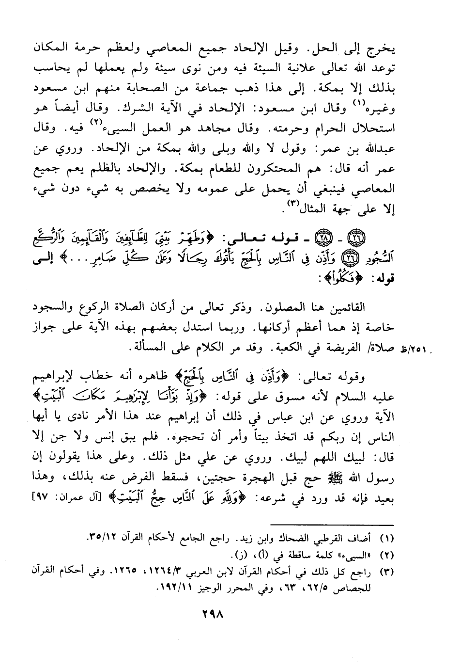 يخرج إلى الحل. وقيل الإلحاد جميع المعاصي ولعظم حرمة المكان توعد الله تعالى علانية السيئة فيه ومن نوى سيئة ولم يعملها لم يحاسب بذلك إلا بمكة. إلى هذا ذهب جماعة من الصحابة منهم ابن مسعود وغيره وقال ابن مسعود: الإلحاد في الآية الشرك. وقال أيضًا هو استحلال الحرام وحرمته. وقال مجاهد هو العمل السيئ فيه. وقال عبد الله بن عمر: وقول لا والله بلى والله بمكة من الإلحاد. وروي عن عمر أنه قال: هم المحتكرون للطعام بمكة. والإلحاد بالظلم يعم جميع المعاصي فينبغي أن يحمل على عمومه ولا يخصص به شيء دون شيء إلا على جهة المثال.