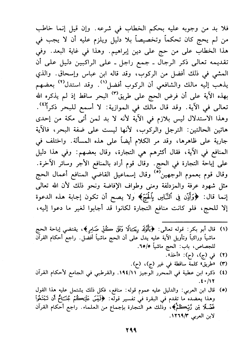 فلا بد من وجوبه عليه بحكم الخطاب في شرعه. وإن قيل إنما خاطب من لم يحج كان تحكمًا وتخصيصًا بلا دليل ويلزم عليه أن لا يجب في هذا الخطاب على من حج على دين إبراهيم. وهذا غاية في البعد. وفي تقديمه تعالى ذكر الرجال -جمع راجل- على الراكبين دليل على أن المشي في ذلك أفضل من الركوب، وقد قاله ابن عباس وإسحاق. والذي يذهب إليه مالك والشافعي أن الركوب أفضل. وقد استدل بعضهم بهذه الآية على أن فرض الحج على طريق البحر ساقط إذ لم يذكره الله تعالى في الآية. وقد قال مالك في الموازية: لا أسمع للبحر ذكرًا. وهذا الاستدلال ليس بلازم في الآية لأنه لا بد لمن أتى مكة من أحدى هاتين الحالتين: الترجل والركوب، لأنها ليست على ضفة البحر، فالآية جارية على ظاهرها، وقد مر الكلام أيضًا على هذه المسألة. واختلف في المنافع في الآية، فقال أكثرهم هي التجارة، وقال بعضهم: وفي هذا دليل على إباحة التجارة في الحج. وقال قوم أراد بالمنافع الأجر وسائر الآخرة. وقال قوم بعموم الوجهتين وقال إسماعيل القاضي المنافع أعمال الحج مثل شهود عرفة والمزدلفة ومنى وطواف الإفاضة ونحو ذلك لأن الله تعالى إنما قال: {وأذن في الناس بالحج} ولا يصح أن تكون إجابة هذه الدعوة إلا للحج، فلو كانت منافع التاجرة لكانوا فد أجابوا لغير ما دعوا إليه،