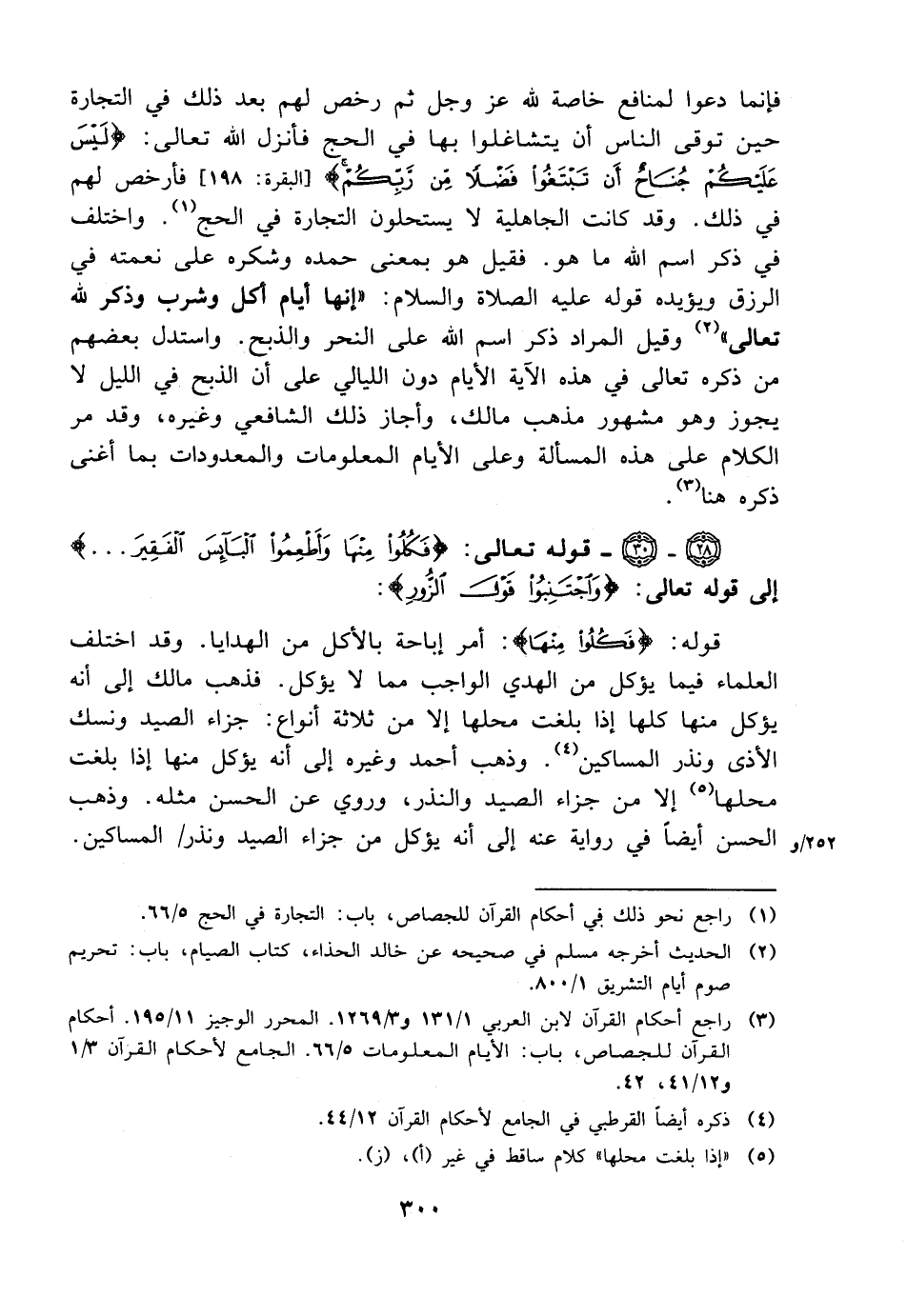 فإنما دعوا لمنافع خاصة لله عز وجل ثم رخص لهم بعد ذلك في التجارة حين توقى الناس أن يتشاغلوا بها في الحج فأنزل الله تعالى: {ليس عليكم جناح أن تبتغوا فضلًا من ربكم} [البقرة: 198] فأرخص لهم في ذلك. وقد كانت الجاهلية لا يستحلون التجارة في الحج. واختلف في ذكر اسم الله ما هو. فقيل هو بمعنى حمده شكره على نعمته في الرزق ويؤيد قوله عليه الصلاة والسلام: ((إنها أيام أكل وشرب وذكر لله تعالى)) وقيل المراد ذكر اسم الله على النحر والذبح. واستدل بعضهم من ذكره تعالى في هذه الآية الأيام دون الليالي على أن الذبح في الليل لا يجوز وهو مشهور مذهب مالك، وأجاز ذلك الشافعي وغيره، وقد مر الكلام على هذه المسألة وعلى الأيام المعلومات والمعدودات بما أغنى عن ذكره هنا.