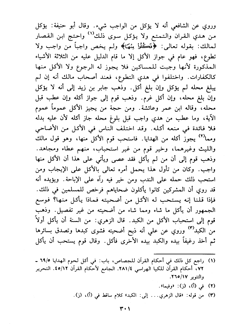 وروي عن الشافعي أنه لا يؤكل من الواجب شيء. وقال أبو حنيفة: يؤكل من هدي القران والتمتع ولا يؤكل سوى ذلك واحتج ابن القصار لمالك بقوله تعالى: {فكلوا منها} ولم يخص واجبًا من واجب ولا تطوع، فهو عام في جواز الأكل إلا ما قام الدليل عليه من الثلاثة الأشياء المذكورة لأنها وجبت للمساكين فلا يجوز له الرجوع ولا الأكل منها كالكفارات. واختلفوا في هدي التطوع، فعند أصحاب مالك أنه إن لم يبلغ محله لم يؤكل وإن بلغ أكل. وذهب جابر بن زيد إلى أنه لا يؤكل وإن بلغ محله، وإن أكل غرم. وذهب قوم إلى جواز أكله وإن عطب قبل محله، وقاله ابن عمر وعائشة. ومن حجة من يجيز الأكل عمومًا عموم الآية، وما عطب من هدي واجب قبل بلوغ محله جاز أكله لأن عليه بدله فلا فائدة في منعه أكله. وقد اختلف الناس في الأكل من الأضاحي ومما يجوز أكله من الهدايا. فاستحب قوم الأكل منها، وهو قول مالك والليث وغيرهما، وخير قوم من غير استحباب، منهم عطاء ومجاهد. وذهب قوم إلى أن من لم يأكل فقد عصى ويأتي على هذا أن الأكل منها واجب. وكان من تأول هذا يحمل أمره تعالى بالأكل على الإيجاب ومن استحب ذلك حمله على الندب ومن خير فيه رآه على الإباحة. ويؤيده أنه قد روي أن المشركين كانوا يأكلون ضحاياهم فرخص