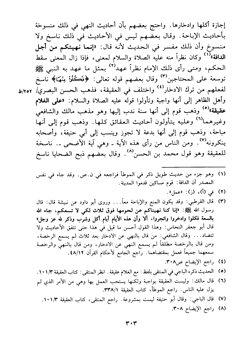 إجازة أكلها وادخارها. واحتج بعضهم بأن أحاديث النهي في ذلك منسوخة بأحاديث الإباحة. وقال بعضهم ليس في الأحاديث في ذلك ناسخ ولا منسوخ وأن ذلك مفسر في الحديث لأنه قال: ((إنما نهيتكم من أجل الدافة)) وكان نظرًا منه عليه الصلاة والسلام لمعنى، فإذا زال المعنى سقط الحكم، ومتى رأى ذلك الإمام نظرًا عهد بمثل ما عهد به النبي صلى الله عليه وسلم توسعة على المحتاجين. وقال بعضهم قوله تعالى: {فكلوا منها} ناسخ لفعلهم من ترك الادخار واختلف في العقيقة، فذهب الحسن البصري وأهل الظاهر إلى أنها واجبة وتأولوا قوله عليه الصلاة والسلام: ((على الغلام عقيقة)) وذهب قوم إلى أنها سنة ندب إليها وهو مذهب مالك والشافعي وغيرهما وعليه يتأولون أحاديث العقائق كلها. وذهب قوم إلى أنها مباحة، وذهب قوم إلى أنها بدعة لا تجوز وينسب إلى أبي حنيفة، وأصحابه ينكرونه. ومن الناسمن رأى هذه الآية -وهي آية الأضحى- ناسخة للعقيقة وهو قول محمد بن الحسن. وقال بعضهم ذبح الضحايا ناسخ