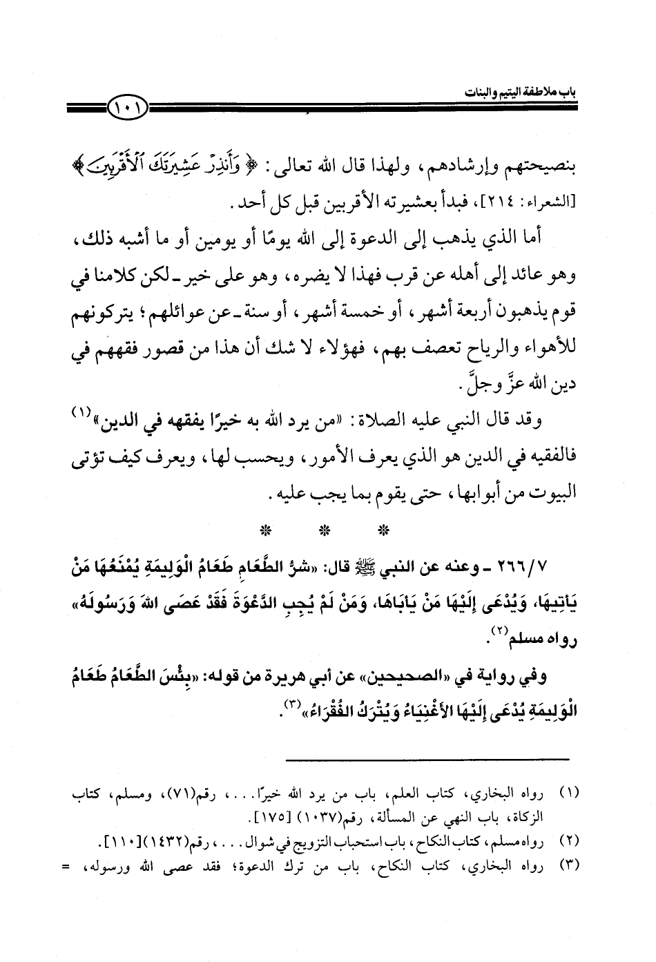 7/266 ـ وعنه عن النبي صلى الله عليه وسلم قال: ((شر الطعام طعام الوليمة يمنعها من يأتيها، ويدعى إليها من يأباها، ومن لم يجب الدعوة فقد عصى الله ورسوله)) رواه مسلم.