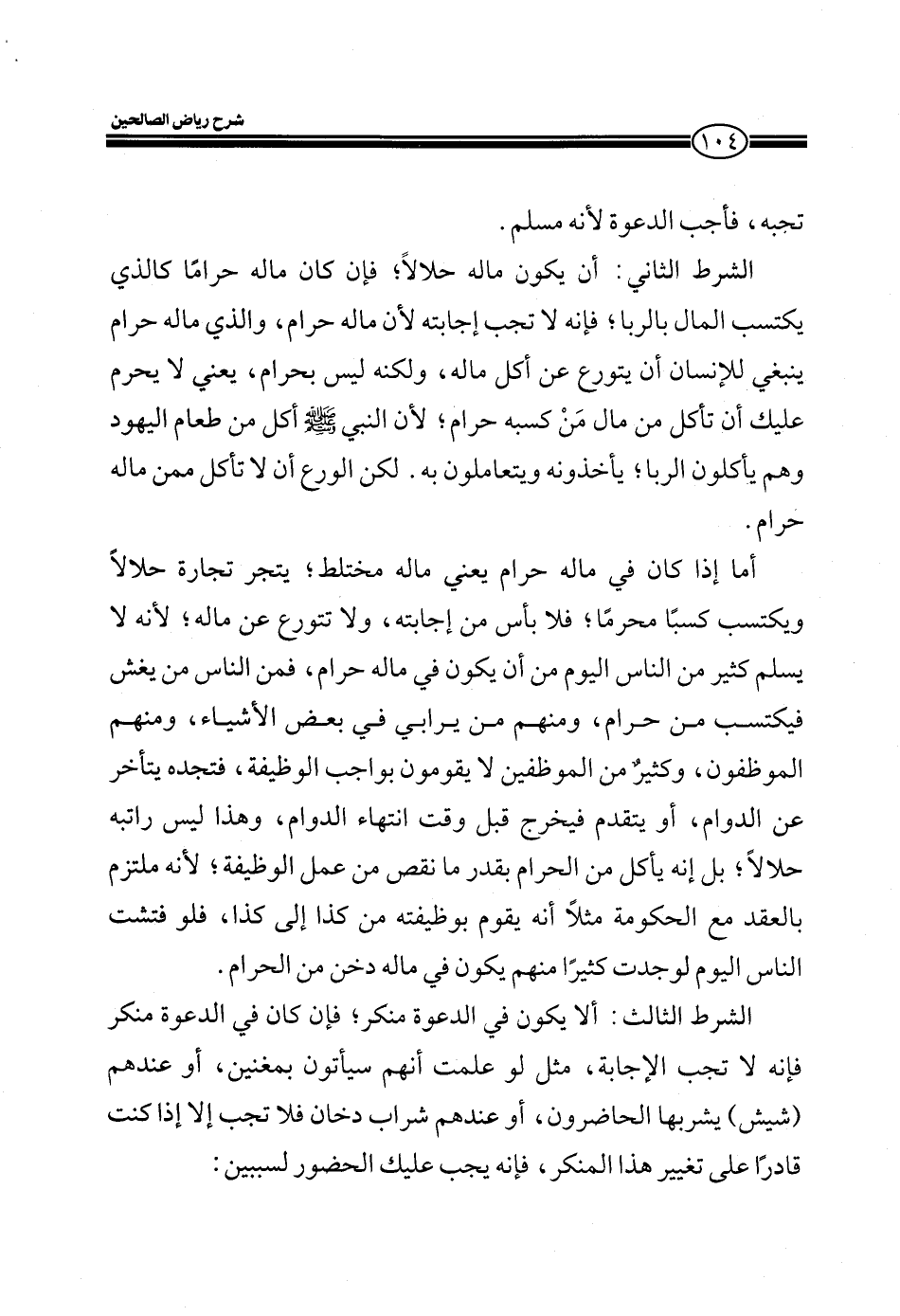 الشرط الثاني: أن يكون ماله حلالاً؛ فإن كان ماله حراماً كالذي يكتسب المال بالربا؛ فإنه لا تجب إجابته لأن ماله حرام، والذي ماله حرام ينبغي للإنسان أن يتورع عن أكل ماله، ولكنه ليس بحرام، يعني لا يحرم عليك أن تأكل من مال من كسبه حرام؛ لأن النبي صلى الله عليه وسلم أكل من طعام اليهود وهم يأكلون الربا؛ يأخذونه ويتعاملون به. لكن الورع أن لا تأكل ممن ماله حرام.