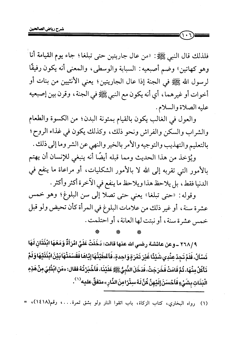 9/268 ـ وعن عائشة رضي الله عنها قالت: دخلت على امرأة ومعها ابنتان لها تسأل، فلم تجد عندي شيئاً غير تمرة واحدة، فأعطيتها إياها فقسمتها بين ابنتيها ولم تأكل منها، ثم قامت فخرجت، فدخل النبي صلى الله عليه وسلم علينا، فأخبرته فقال: ((من ابتلي من هذه البنات بشيء فأحسن إليهن كن له ستراً من النار)) متفق عليه.