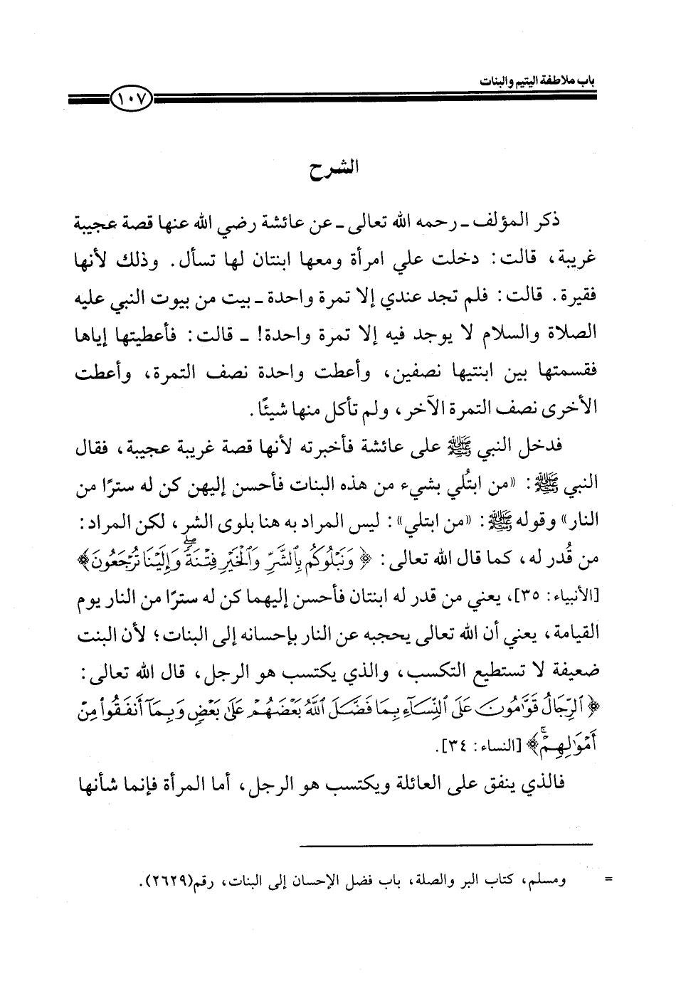 فدخل النبي صلى الله عليه وسلم على عائشة فأخبرته لأنها قصة غريبة عجيبة، فقال النبي صلى الله عليه وسلم: ((من ابتلي بشيء من هذه البنات فأحسن إليهن كن له ستراً من النار)) وقوله صلى الله عليه وسلم: ((من ابتلي)) : ليس المراد به هنا بلوى الشر، لكن المراد: من قدر له، كما قال الله تعالى: (وَنَبْلُوكُمْ بِالشَّرِّ وَالْخَيْرِ فِتْنَةً وَإِلَيْنَا تُرْجَعُونَ) [الأنبياء: 35] يعني من قدر له ابنتان فأحسن إليهما كن له ستراً من النار يوم القيامة، يعني أن الله تعالى يحجبه عن النار بإحسانه إلى البنات؛ لأن البنت ضعيفة لا تستطيع التكسب، والذي يكتسب هو الرجل، قال الله تعالى: (الرِّجَالُ قَوَّامُونَ عَلَى النِّسَاءِ بِمَا فَضَّلَ اللَّهُ بَعْضَهُمْ عَلَى بَعْضٍ وَبِمَا أَنْفَقُوا مِنْ أَمْوَالِهِمْ) [النساء: 34] .