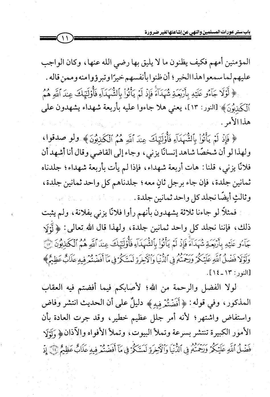 فمثلاً لو جاءنا ثلاثة يشهدون بأنهم رأوا فلانا يزني بفلانة، ولم يثبت ذلك، فإننا نجلد كل واحد ثمانين جلدة، ولهذا قال الله تعالى: (لَوْلا جَاءُوا عَلَيْهِ بِأَرْبَعَةِ شُهَدَاءَ فَإِذْ لَمْ يَأْتُوا بِالشُّهَدَاءِ فَأُولَئِكَ عِنْدَ اللَّهِ هُمُ الْكَاذِبُونَ وَلَوْلا فَضْلُ اللَّهِ عَلَيْكُمْ وَرَحْمَتُهُ فِي الدُّنْيَا وَالْآخِرَةِ لَمَسَّكُمْ فِي مَا أَفَضْتُمْ فِيهِ عَذَابٌ عَظِيمٌ) [النور: 13 ـ 14] .