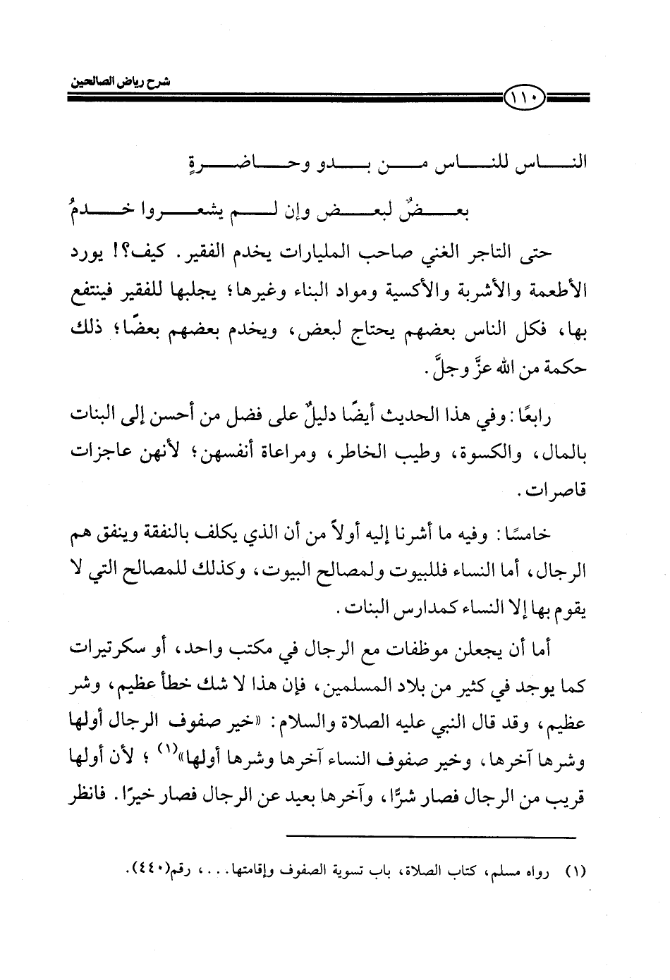 رابعاً: وفي هذا الحديث أيضاً دليل على فضل من أحسن إلى البنات بالمال، والكسوة، وطيب الخاطر، ومراعاة أنفسهن؛ لأنهن عاجزات قاصرات.