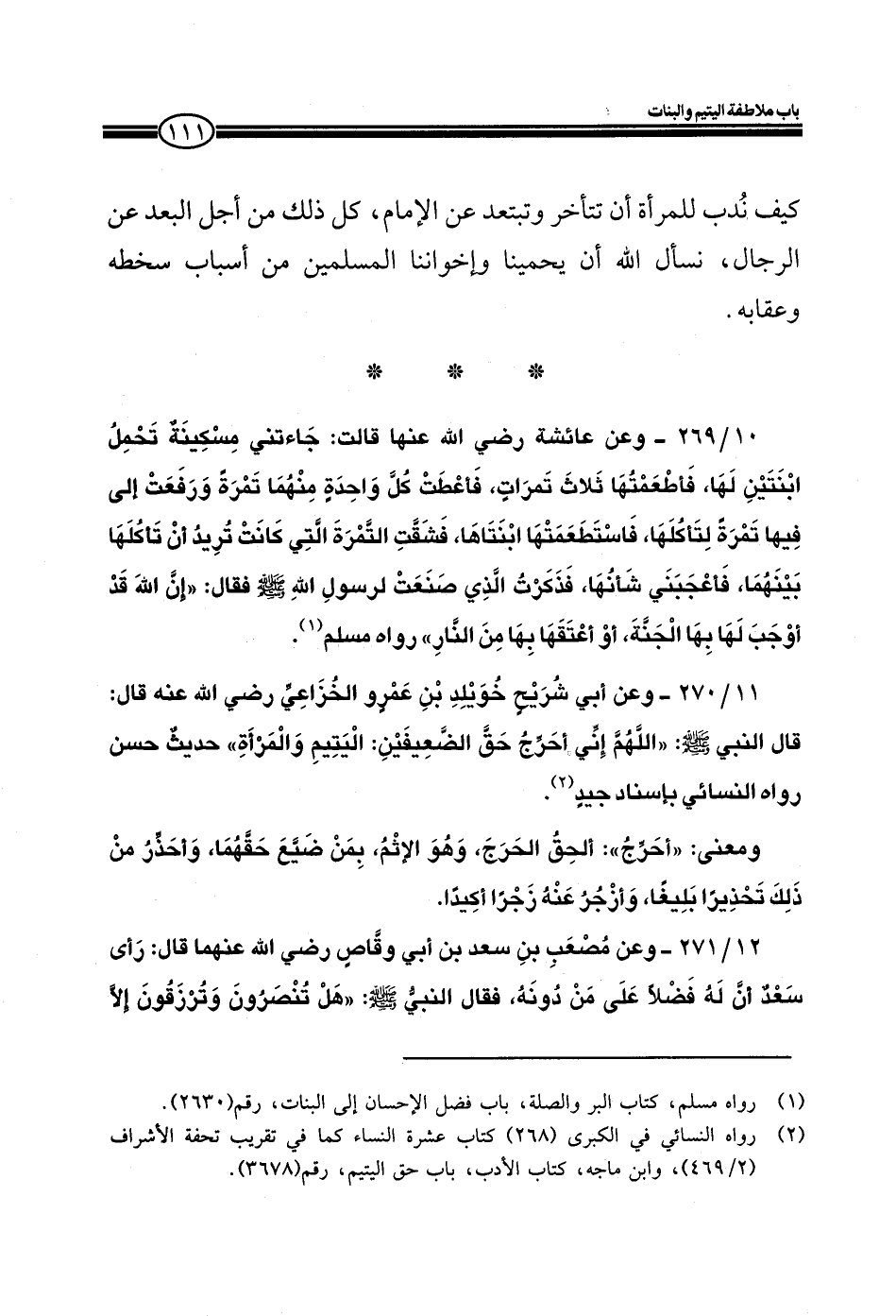 11/270 ـ وعن أبي شريح خويلد بن عمرو الخزاعي رضي الله عنه قال: قال النبي صلى الله عليه وسلم: ((اللهم إني أحرج حق الضعيفين: اليتيم والمرأة)) حديث حسن رواه النسائي بإسناد جيد.