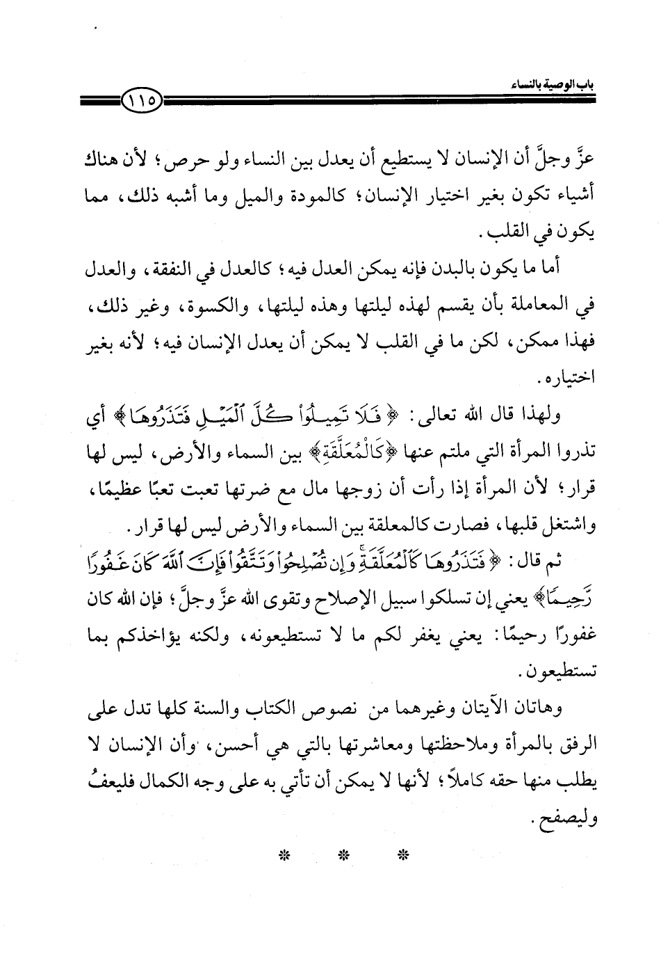 وهاتان الآيتان وغيرهما من نصوص الكتاب والسنة كلها تدل على الرفق بالمرأة وملاحظتها ومعاشرتها بالتي هي أحسن، وأن الإنسان لا يطلب منها حقه كاملاً؛ لأنها لا يمكن أن تأتي به على وجه الكمال فليعف وليصفح.