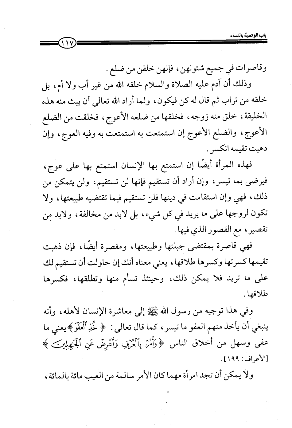 وذلك أن آدم عليه الصلاة والسلام خلقه الله من غير أب ولا أم، بل خلقه من تراب ثم قال له كن فيكون، ولما أراد الله تعالى أن يبث من هذه الخليقة، خلق منه زوجه، فخلقها من ضلعه الأعوج، فخلقت من الضلع الأعوج، والضلع الأعوج إن استمتعت به استمتعت به وفيه العوج، وإن ذهبت تقيمه انكسر.