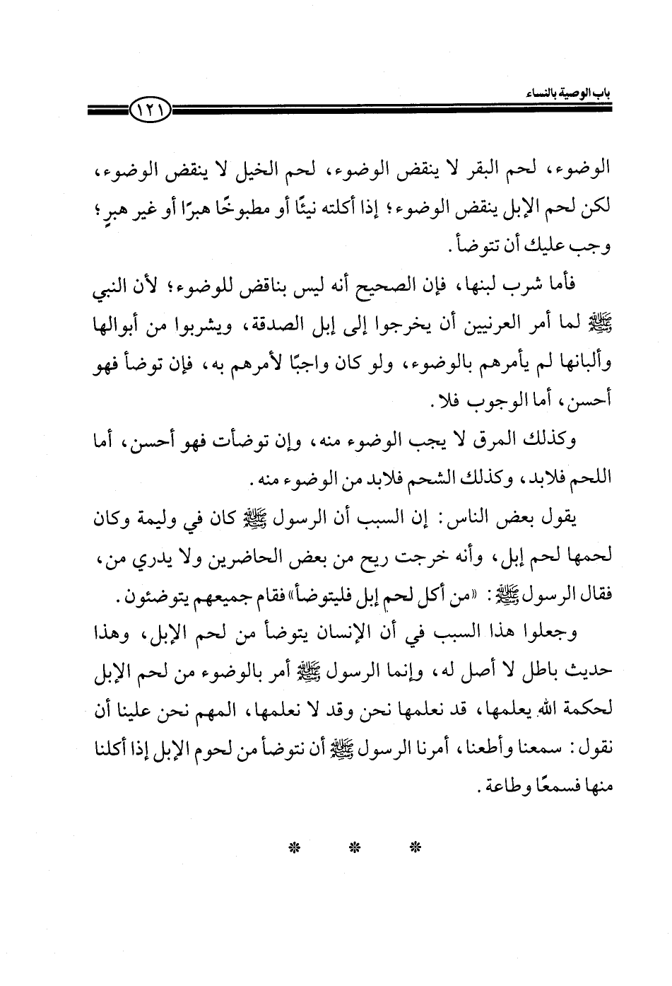 وجعلوا هذا السبب في أن الإنسان يتوضأ من لحم الإبل، وهذا حديث باطل لا أصل له، وإنما الرسول صلى الله عليه وسلم أمر بالوضوء من لحم الإبل لحكمة الله يعلمها، قد نعلمها نحن وقد لا نعلمها، المهم نحن علينا أن نقول: سمعنا وأطعنا، أمرنا الرسول صلى الله عليه وسلم أن نتوضأ من لحوم الإبل إذا أكلنا منها فسمعاً وطاعة.