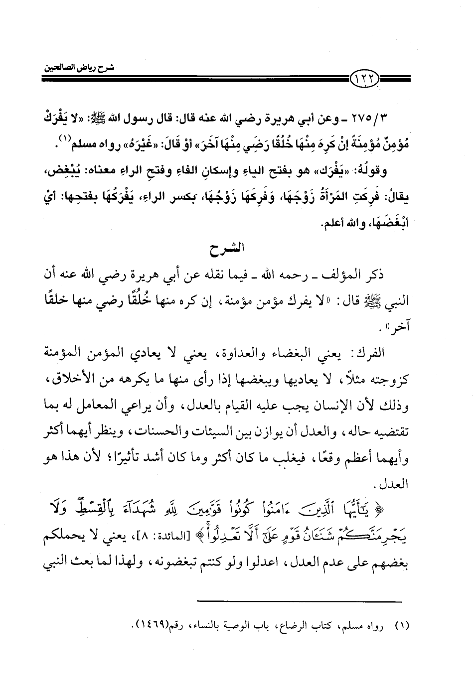 3/275 وعن أبي هريرة رضي الله عنه قال: قال رسول الله صلى الله عليه وسلم: ((لا يفرك مؤمن مؤمنة إن كره منها خلقاً رضي منها آخر)) أو قال: ((غيره)) رواه مسلم.