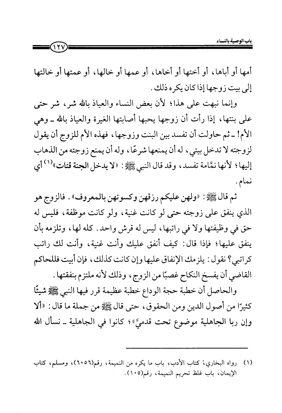 وإنما نبهت على هذا؛ لأن بعض النساء والعياذ بالله شر، شر حتى على بنتها، إذا رأت أن زوجها يحبها أصابتها الغيرة والعياذ بالله ـ وهي الأم ـ ثم حاولت أن تفسد بين البنت وزجها، فهذه الأم للزوج أن يقول لزوجته لا تدخل بيتي، له أن يمنعها شرعاً، وله أن يمنع زوجته من الذهاب إليها؛ لأنها نمامة تفسد، وقد قال النبي صلى الله عليه وسلم: ((لا يدخل الجنة قتات)) أي نمام.