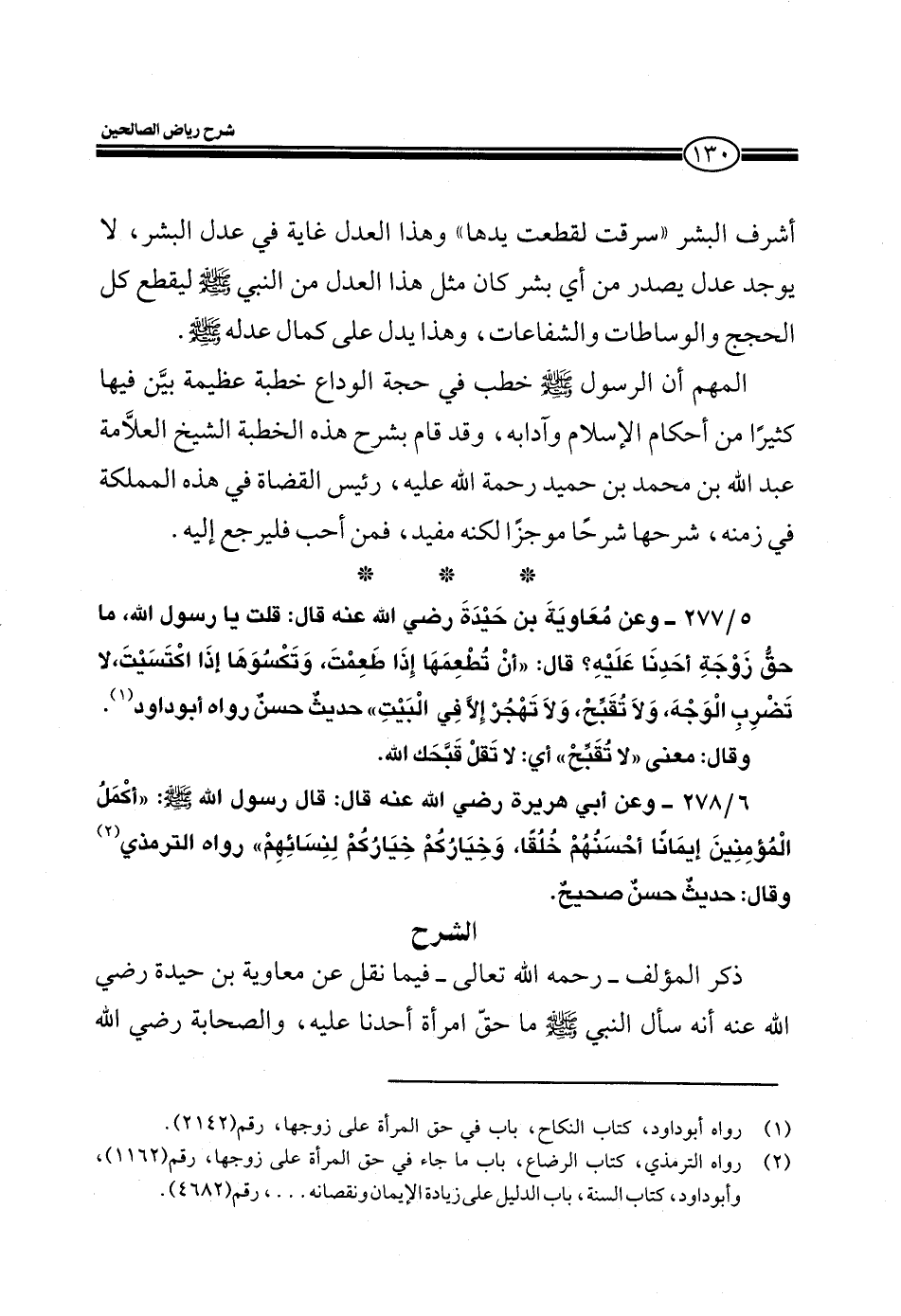 5/277 ـ وعن معاوية بن حيدة رضي الله عنه قال: قلت يا رسول الله، ما حق زوجة أحدنا عليه؟ قال: ((أن تطعمها إذا طعمت، وتكسوها إذا اكتسيت، لا تضرب الوجه، ولا تقبح، ولا تهجر إلا في البيت)) حديث حسن رواه أبو داود.
