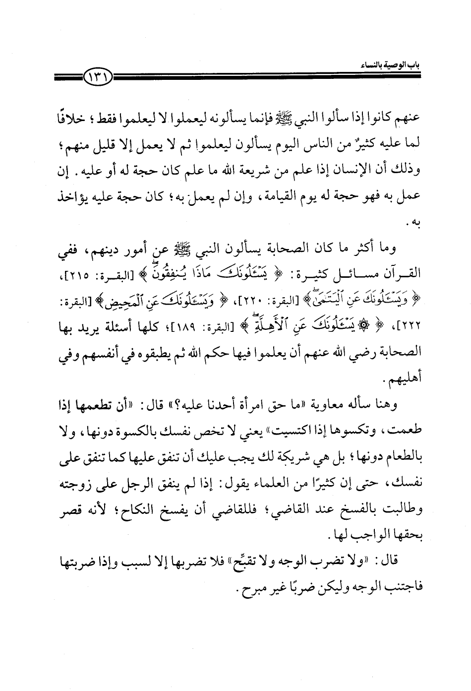 وما أكثر ما كان الصحابة يسألون النبي صلى الله عليه وسلم عن أمور دينهم، ففي القرآن مسائل كثير: (يَسْأَلونَكَ مَاذَا يُنْفِقُونَ) [البقرة: 215] ، (وَيَسْأَلونَكَ عَنِ الْيَتَامَى) [البقرة: 220] ، (وَيَسْأَلونَكَ عَنِ الْمَحِيض) [البقرة: 222] ، (يَسْأَلونَكَ عَنِ الْأَهِلَّةِ) [البقرة: 189] ؛ كلها أسئلة يريد بها الصحابة رضي الله عنهم أن يعلموا فيها حكم الله ثم يطبقوه في أنفسهم وفي أهليهم.