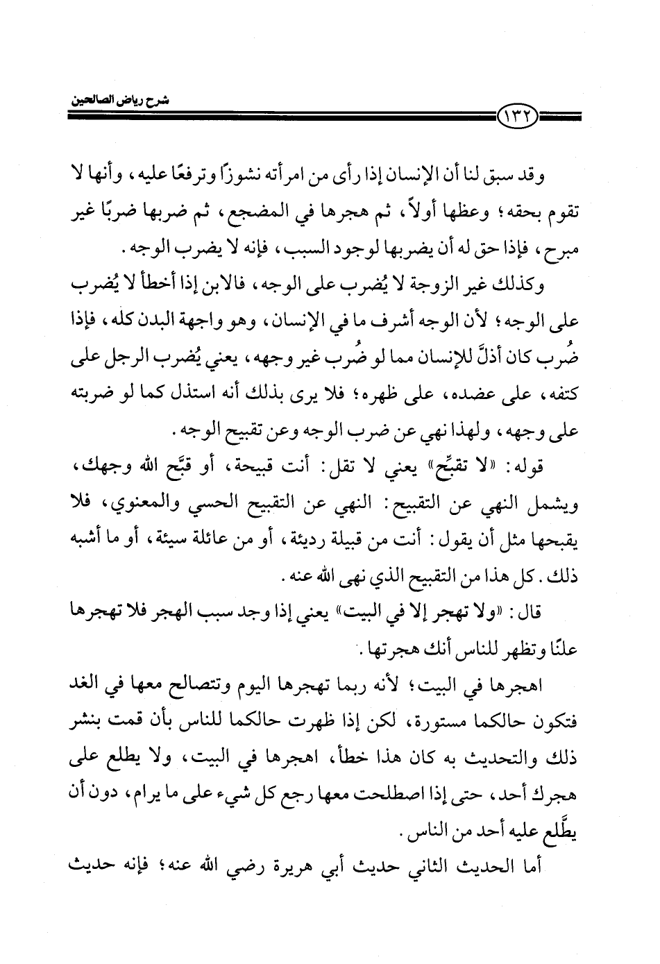 وقد سبق لنا أن الإنسان إذا رأى من امرأته نشوزاً وترفعاً عليه، وأنها لا تقوم بحقه؛ وعظها أولاً، ثم هجرها في المضجع، ثم ضربها ضرباً غير مبرح فإذا حق له أن يضربها لوجود السبب، فإنه لا يضرب الوجه.