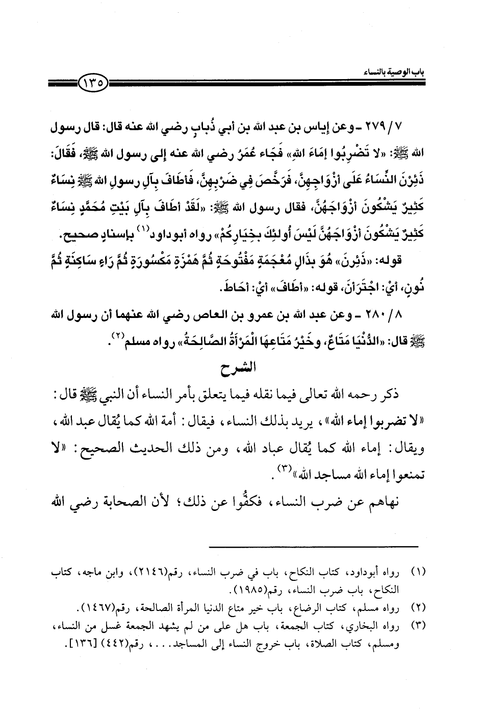 7/279 ـ وعن إياس بن عبد الله بن أبي ذباب رضي الله عنه قال: قال رسول الله صلى الله عليه وسلم: ((لا تضربوا إماء الله)) فجاء عمر رضي الله عنه إلى رسول الله صلى الله عليه وسلم، فقال: ذئرن النساء على أزواجهن فرخص في ضربهن، فأطاف بآل رسول الله صلى الله عليه وسلم نساء كثير يشكون ازواجهن، فقال رسول الله صلى الله عليه وسلم: ((لقد أطاف بآل بيت محمد نساء كثير يشكون أزواجهن ليس أولئك بخياركم)) رواه أبو داود بإسناد صحيح.