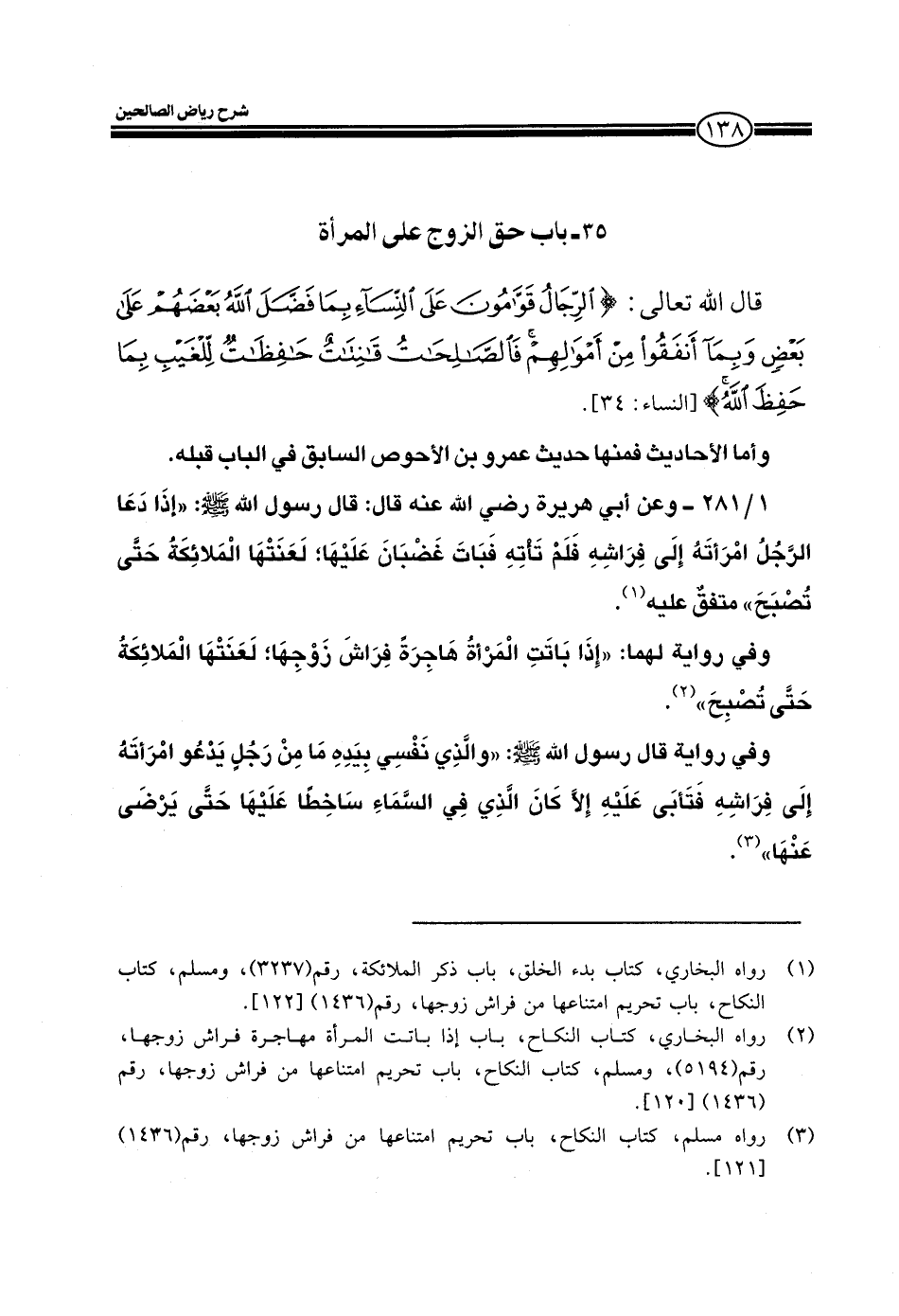 1/281 ـ وعن أبي هريرة رضي الله عنه قال: قال رسول الله صلى الله عليه وسلم: ((إذا دعا الرجل امرأته إلى فراشه فلم تأته فبات غضبان عليها؛ لعنتها الملائكة حتى تصبح)) متفق عليه.