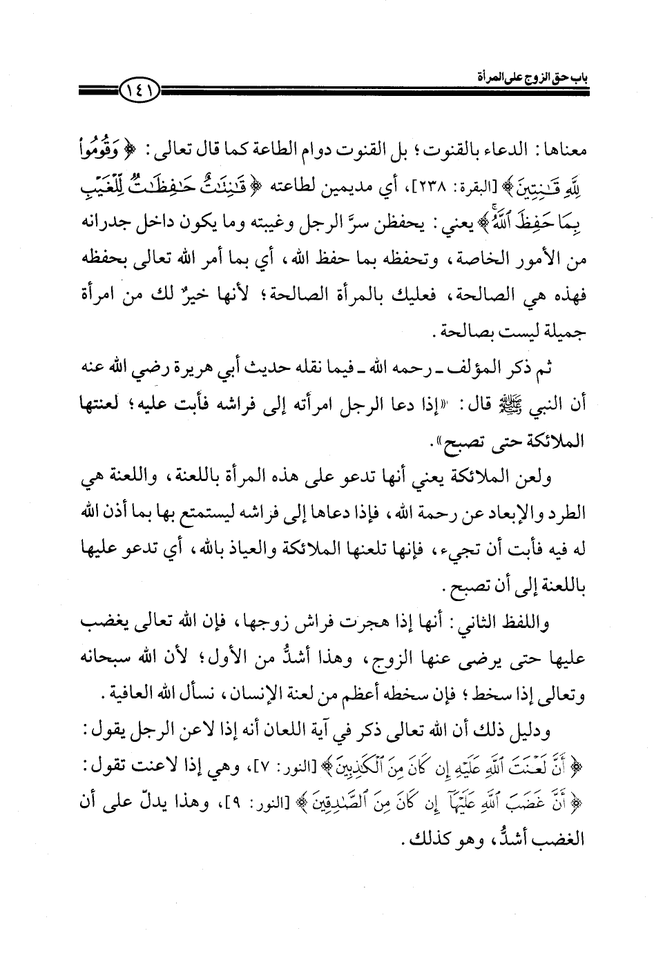 ثم ذكر المؤلف ـ رحمه الله ـ فيما نقله حديث أبي هريرة رضي الله عنه أن النبي صلى الله عليه وسلم قال: ((إذا دعا الرجل امرأته إلى فراشه فأبت عليه؛ لعنتها الملائكة حتى تصبح)) .