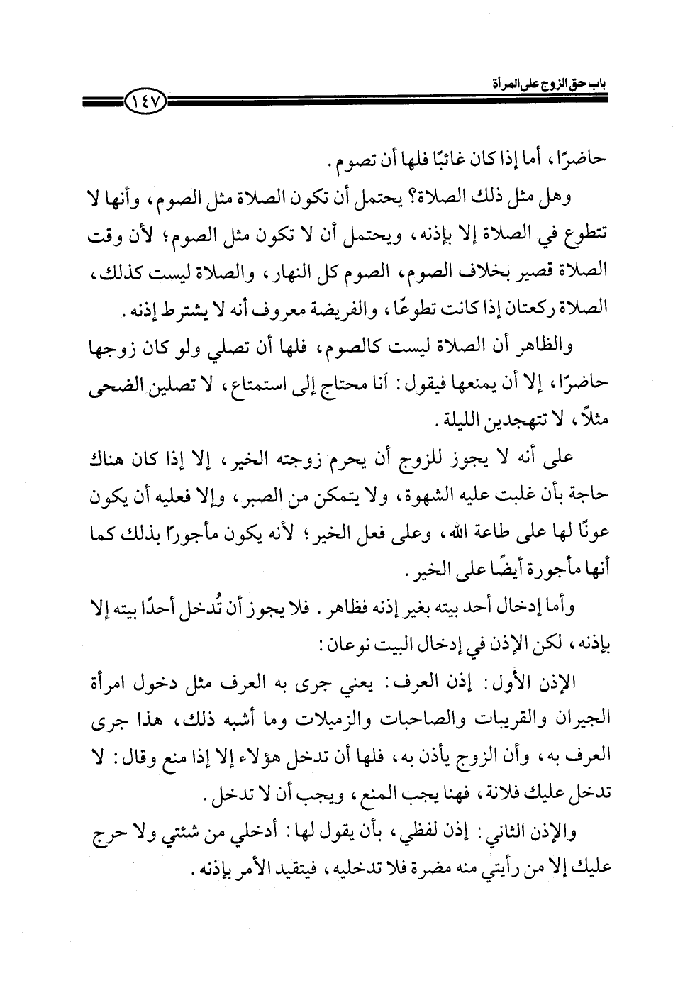 الإذن الأول: إذن العرف: يعني جرى به العرف مثل دخول امرأة الجيران والقريبات والصاحبات والزميلات وما أشبه ذلك، هذا جرى العرف به، وأن الزوج يأذن به، فلها أن تدخل هؤلاء إلا إذا منع وقال: لا تدخل عليك فلانة، فهنا يجب المنع، ويجب أن لا تدخل.